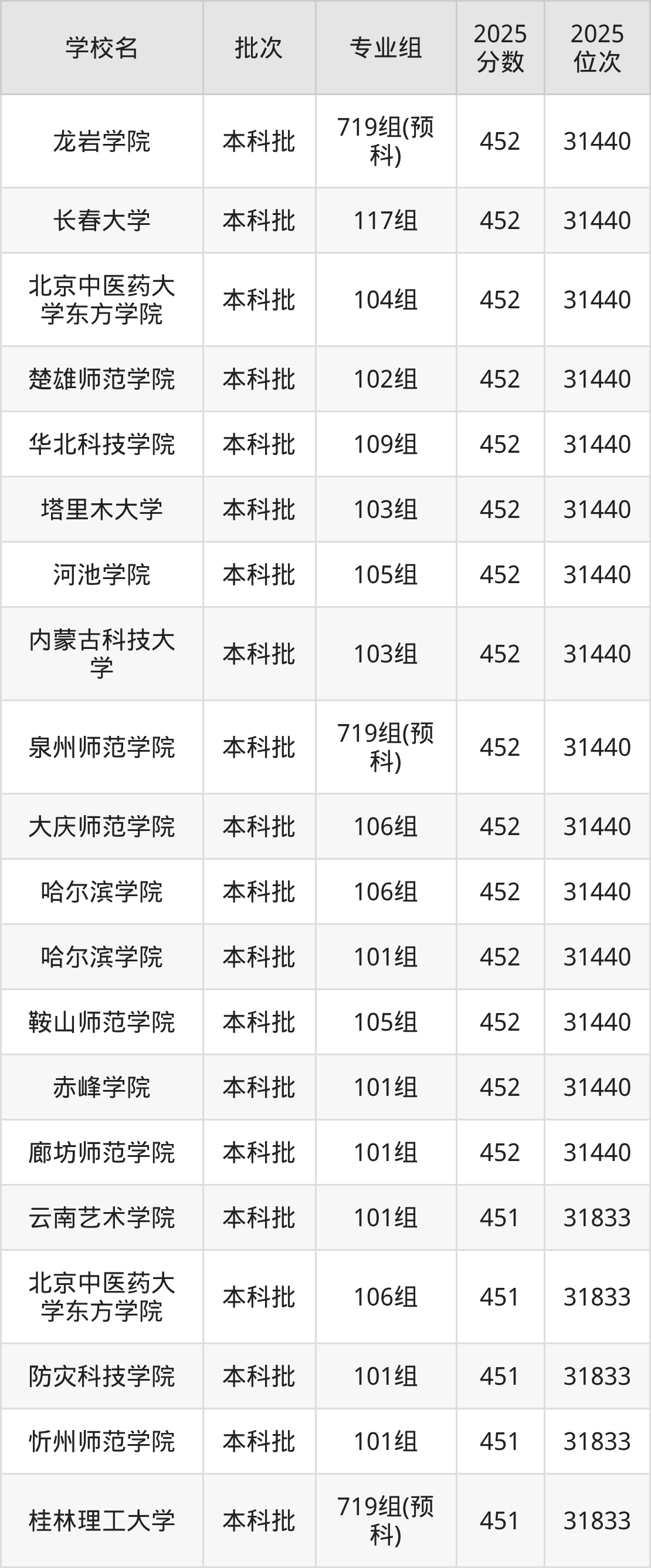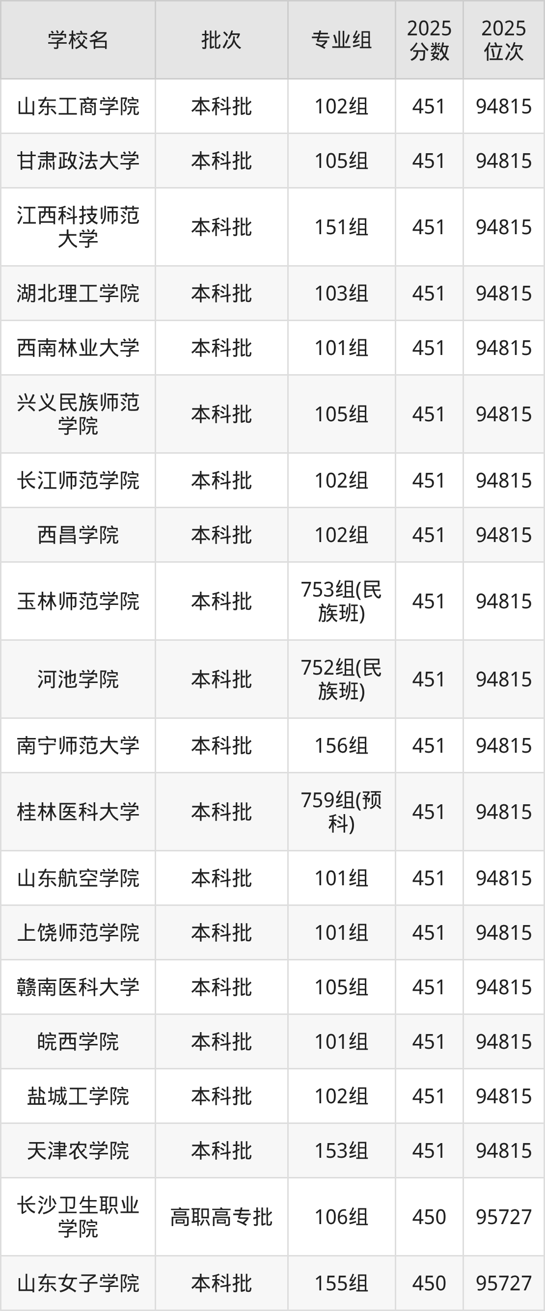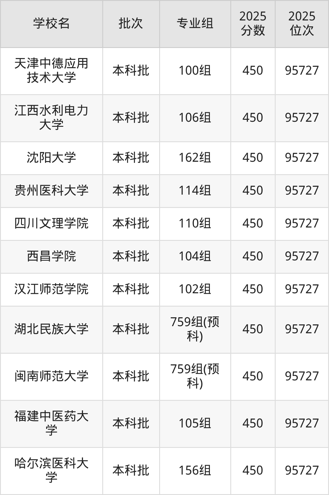 2025年广西高考物理类450分(94816名~95727名)能上的大学有哈尔滨医科大学156组、福建中医药大学105组、闽南师范大学759组(预科)、湖北民族大学759组(预科)等。