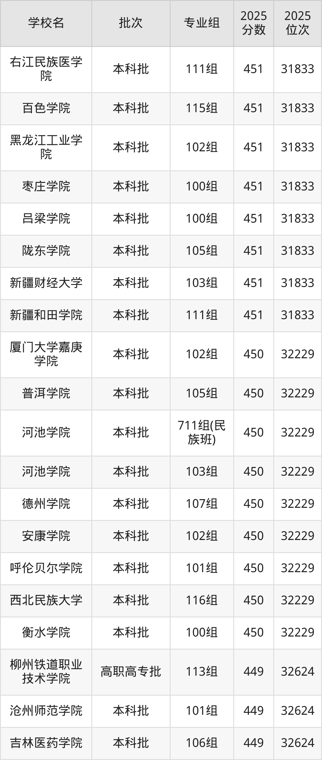2025年广西高考历史类450分(31834名~32229名)能上的大学有衡水学院100组、德州学院107组、河池学院103组、河池学院711组(民族班)等。