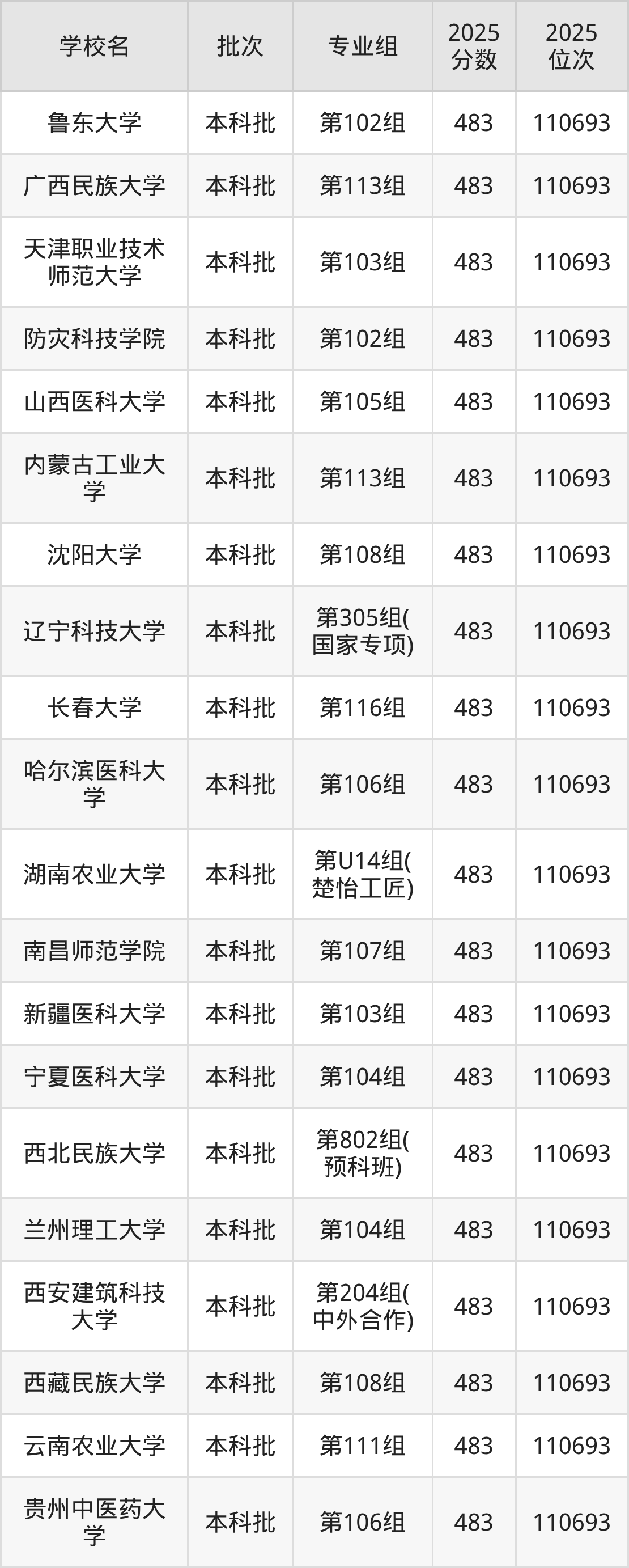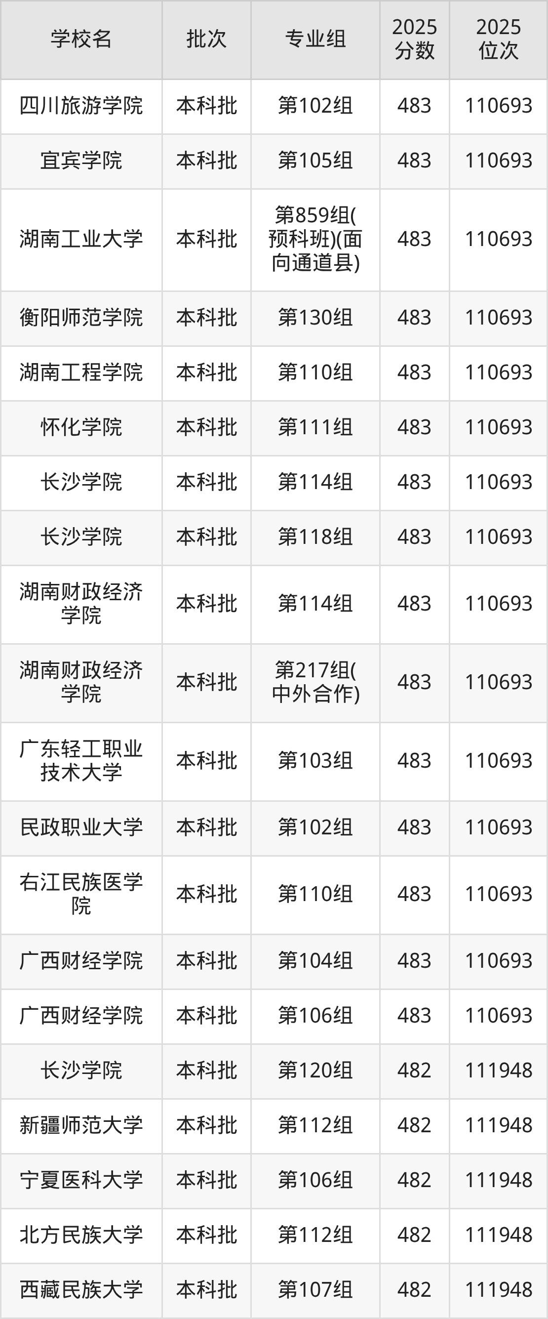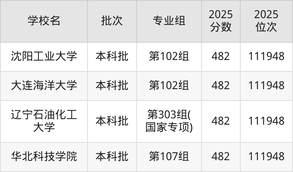 2025年湖南高考物理类482分(110694名~111948名)能上的大学有华北科技学院第107组、辽宁石油化工大学第303组(国家专项)、大连海洋大学第102组、沈阳工业大学第102组等。