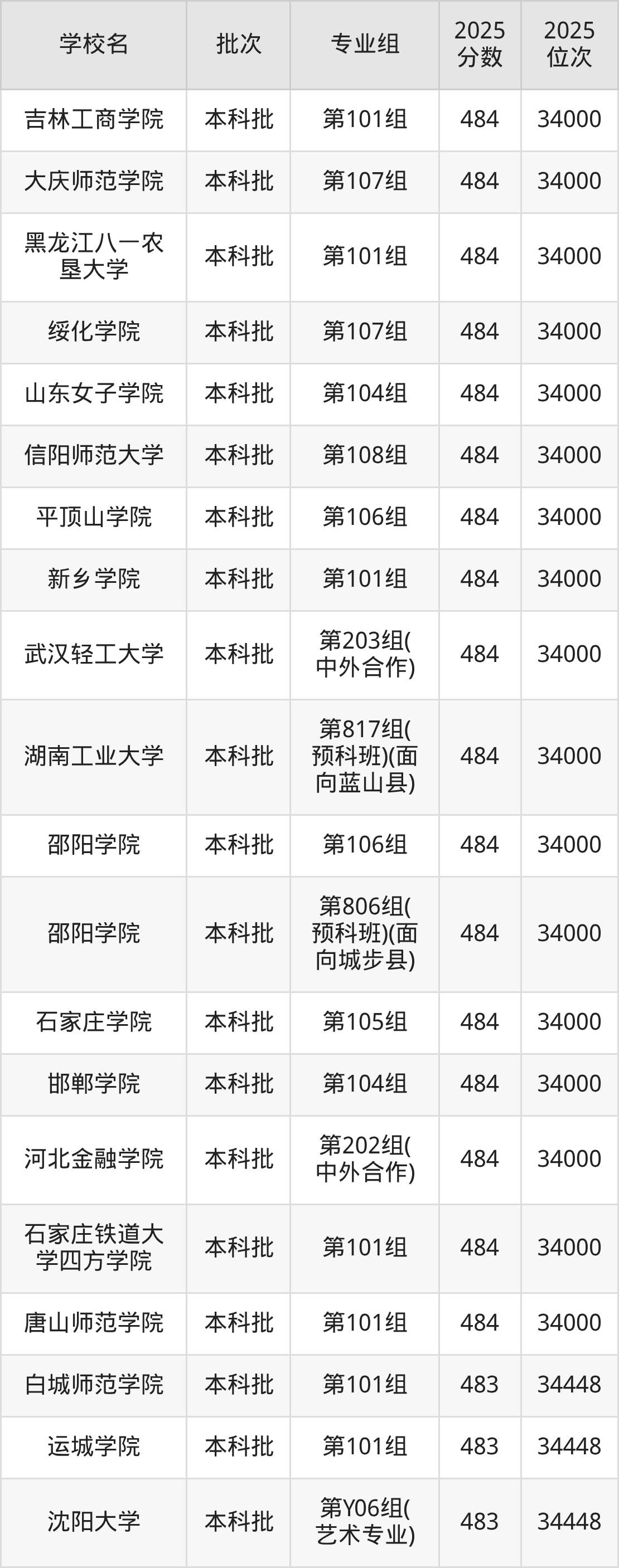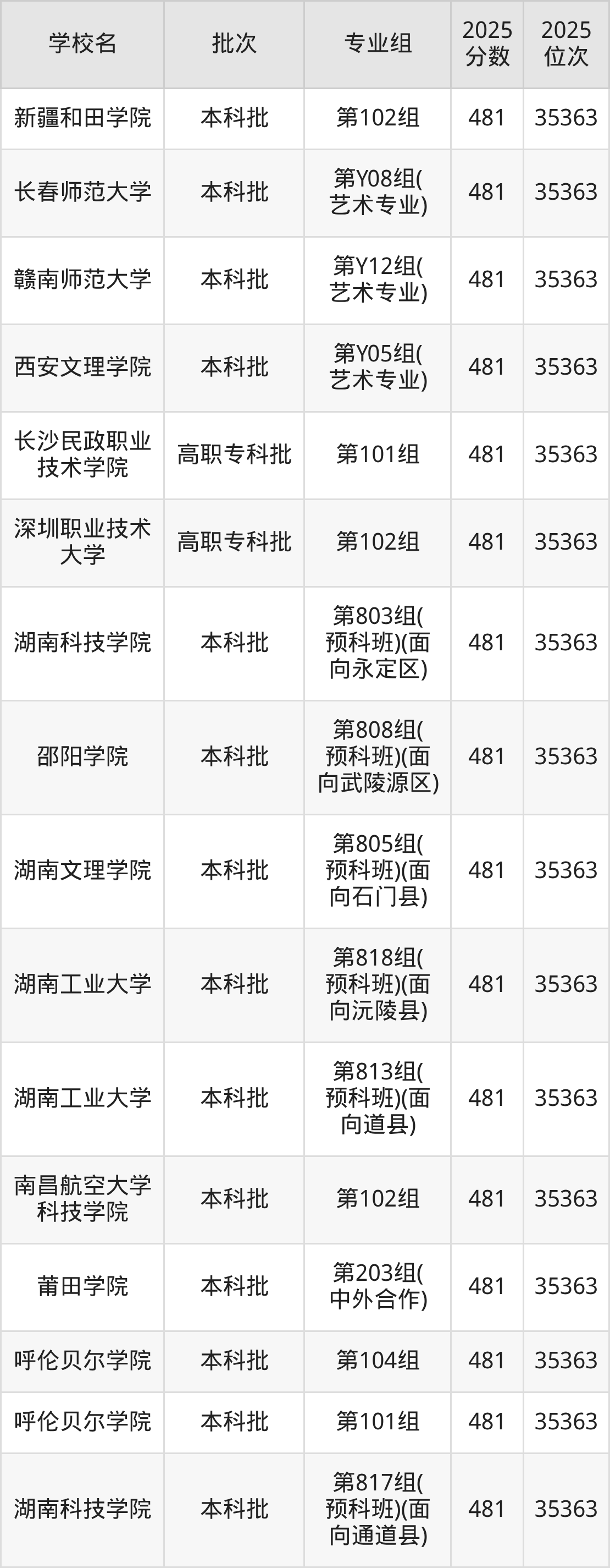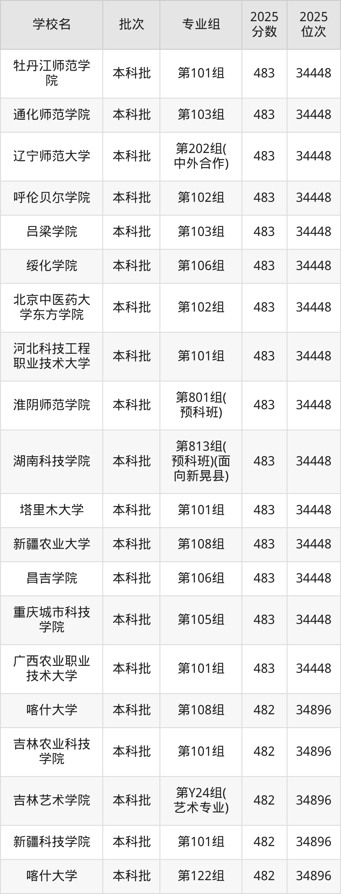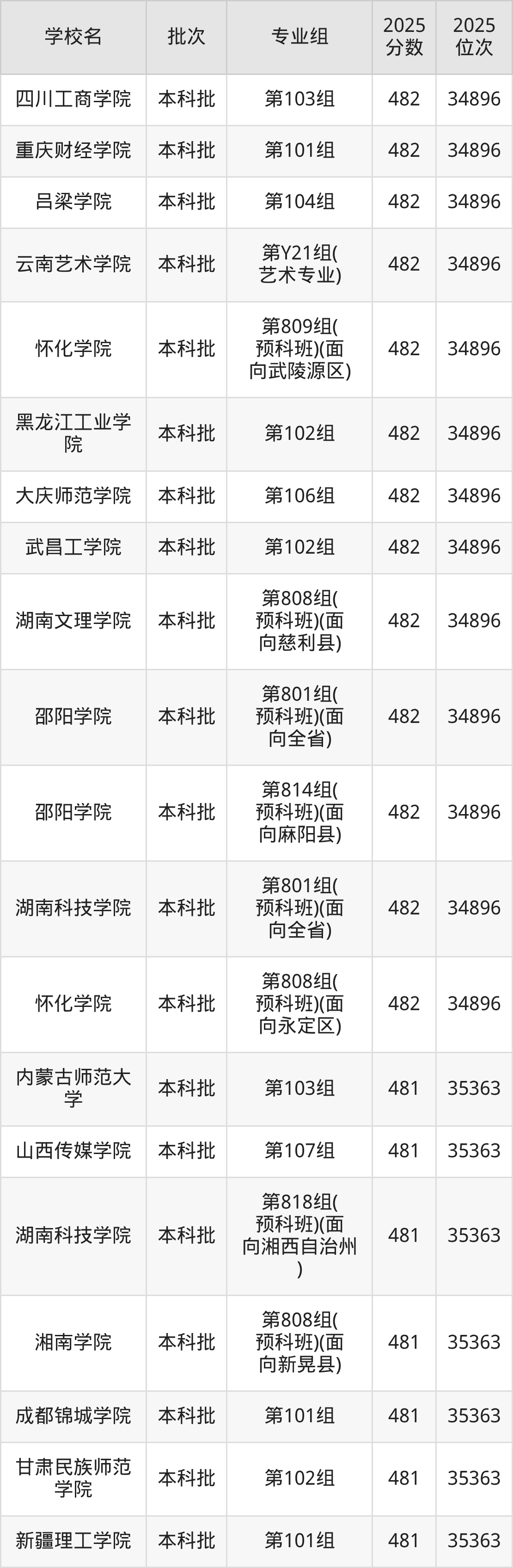 2025年湖南高考历史类482分(34449名~34896名)能上的大学有吕梁学院第104组、吉林农业科技学院第101组、黑龙江工业学院第102组、大庆师范学院第106组等。