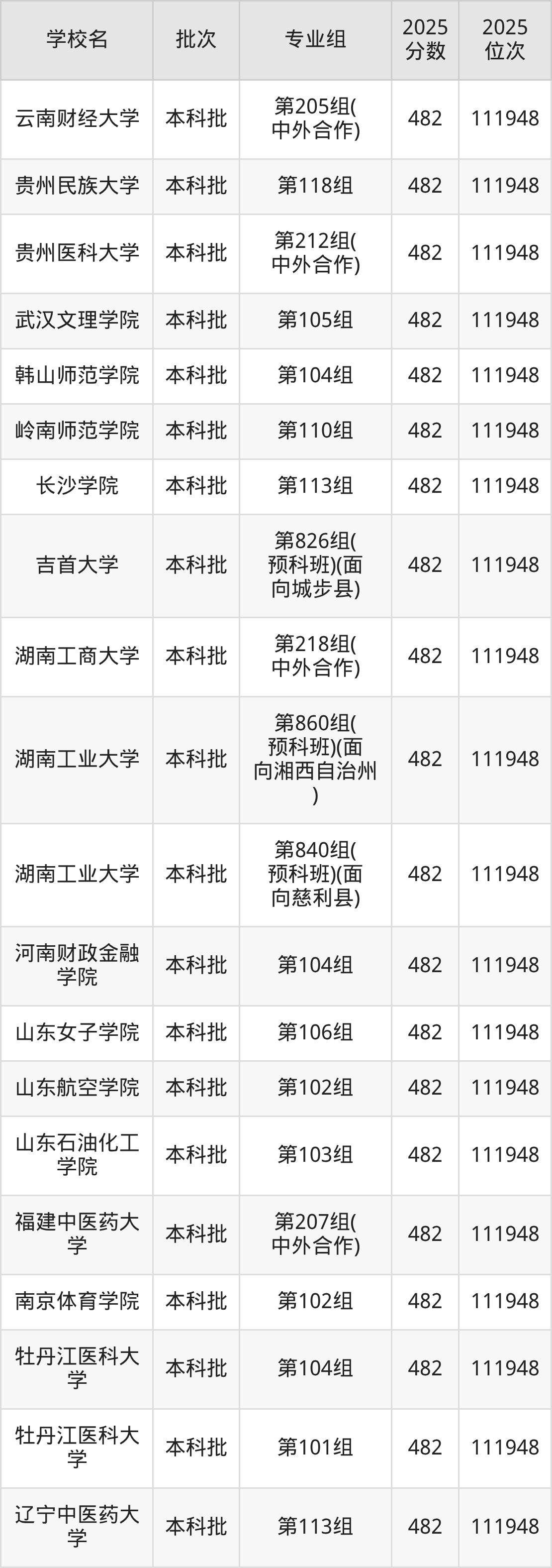 湖南高考482分:历史类排名34896位、物理类排名111948位。该分数位次对应能上的大学历史类有吕梁学院第104组、吉林农业科技学院第101组;物理类有华北科技学院第107组、辽宁石油化工大学第303组(国家专项),更多名单如下文所示,2026届考生可参考。