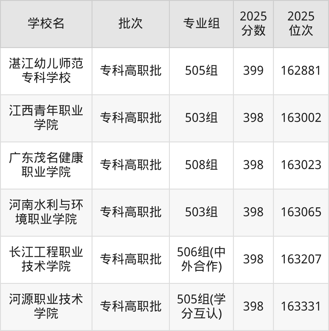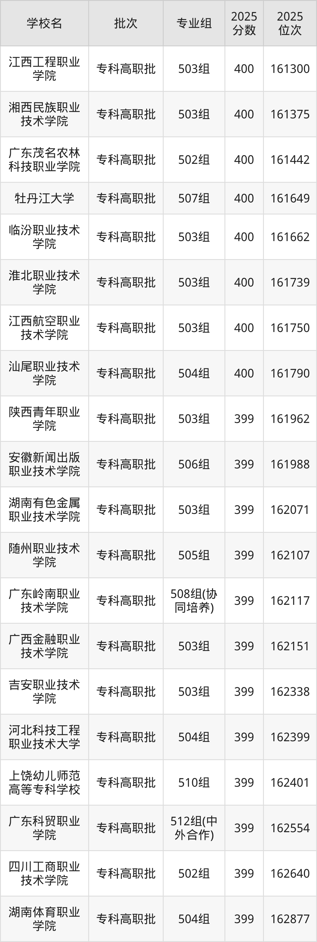 2025年广东高考历史类399分(161801名~162935名)能上的大学有湖南体育职业学院504组、广东岭南职业技术学院508组(协同培养)、四川工商职业技术学院502组、随州职业技术学院505组等。