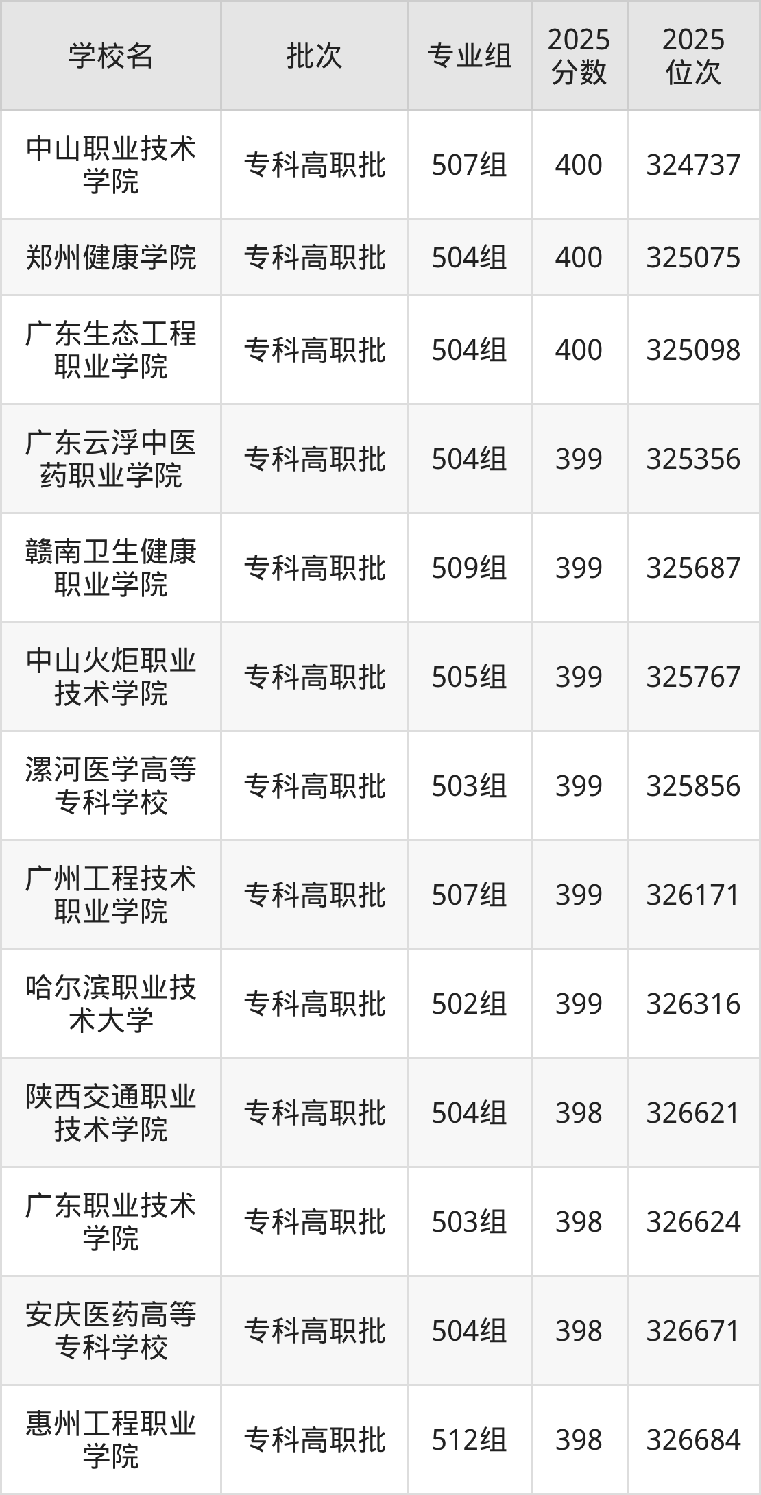 2025年广东高考物理类399分(325156名~326337名)能上的大学有哈尔滨职业技术大学502组、广州工程技术职业学院507组、中山火炬职业技术学院505组、漯河医学高等专科学校503组等。