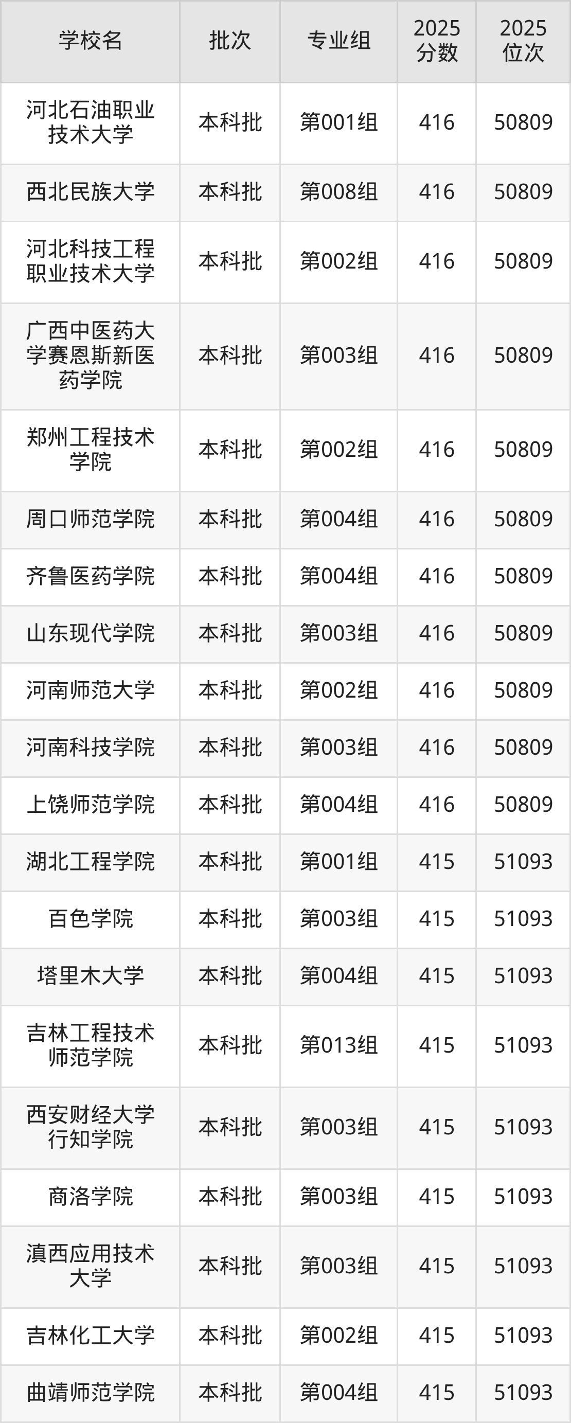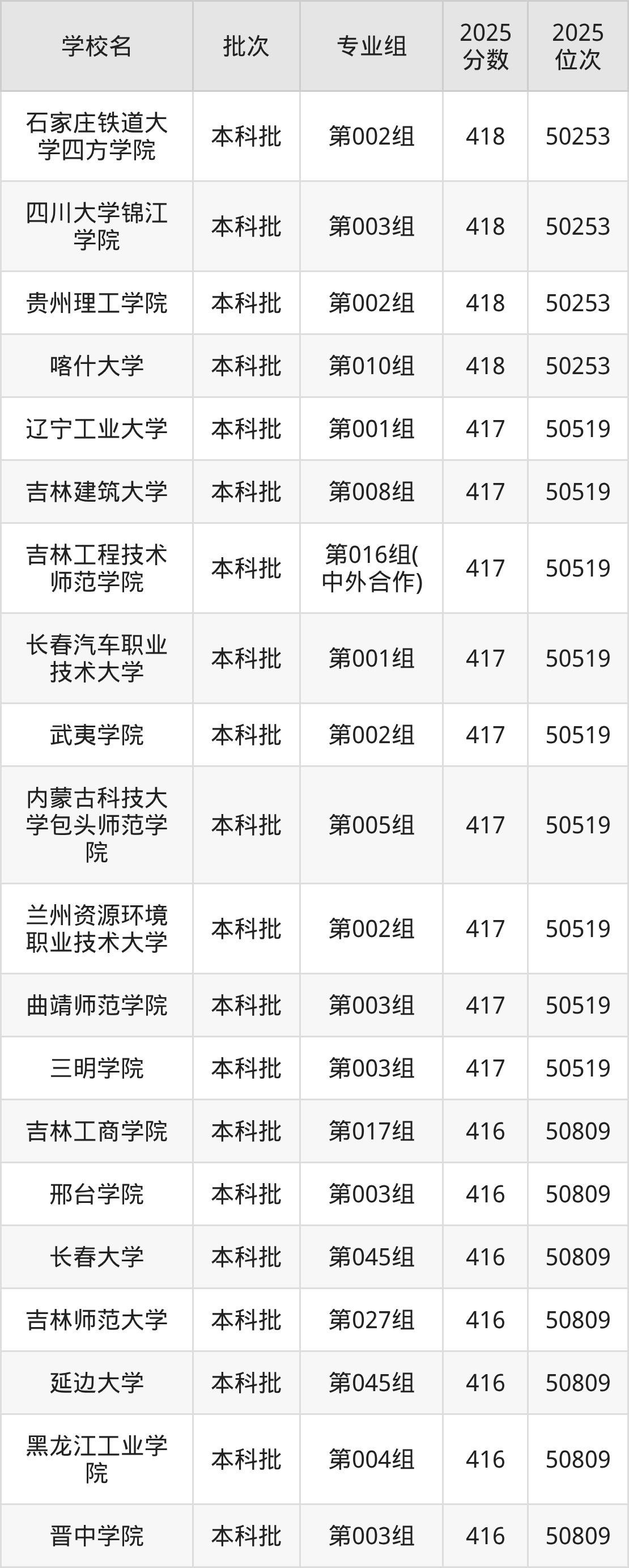 2025年吉林高考物理类416分(50520名~50809名)能上的大学有邢台学院第003组、河北科技工程职业技术大学第002组、河北石油职业技术大学第001组、晋中学院第003组等。