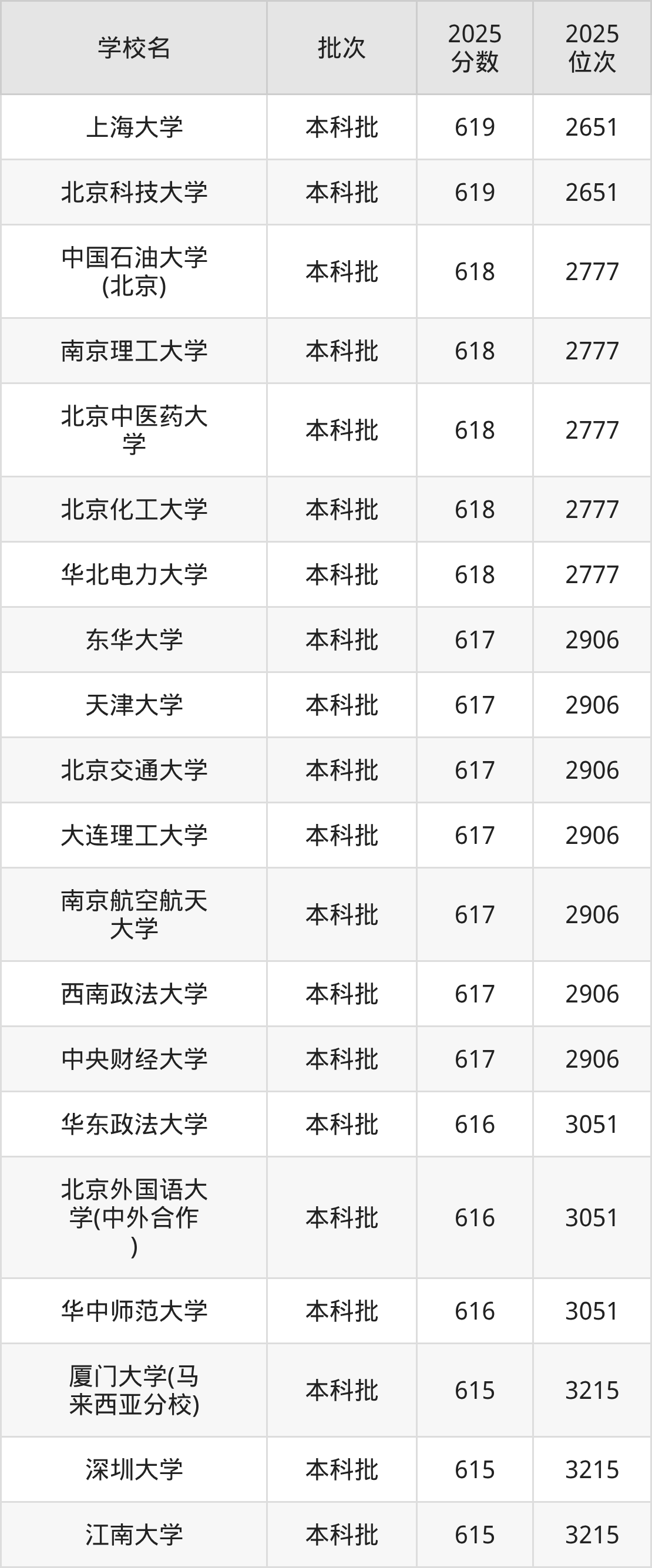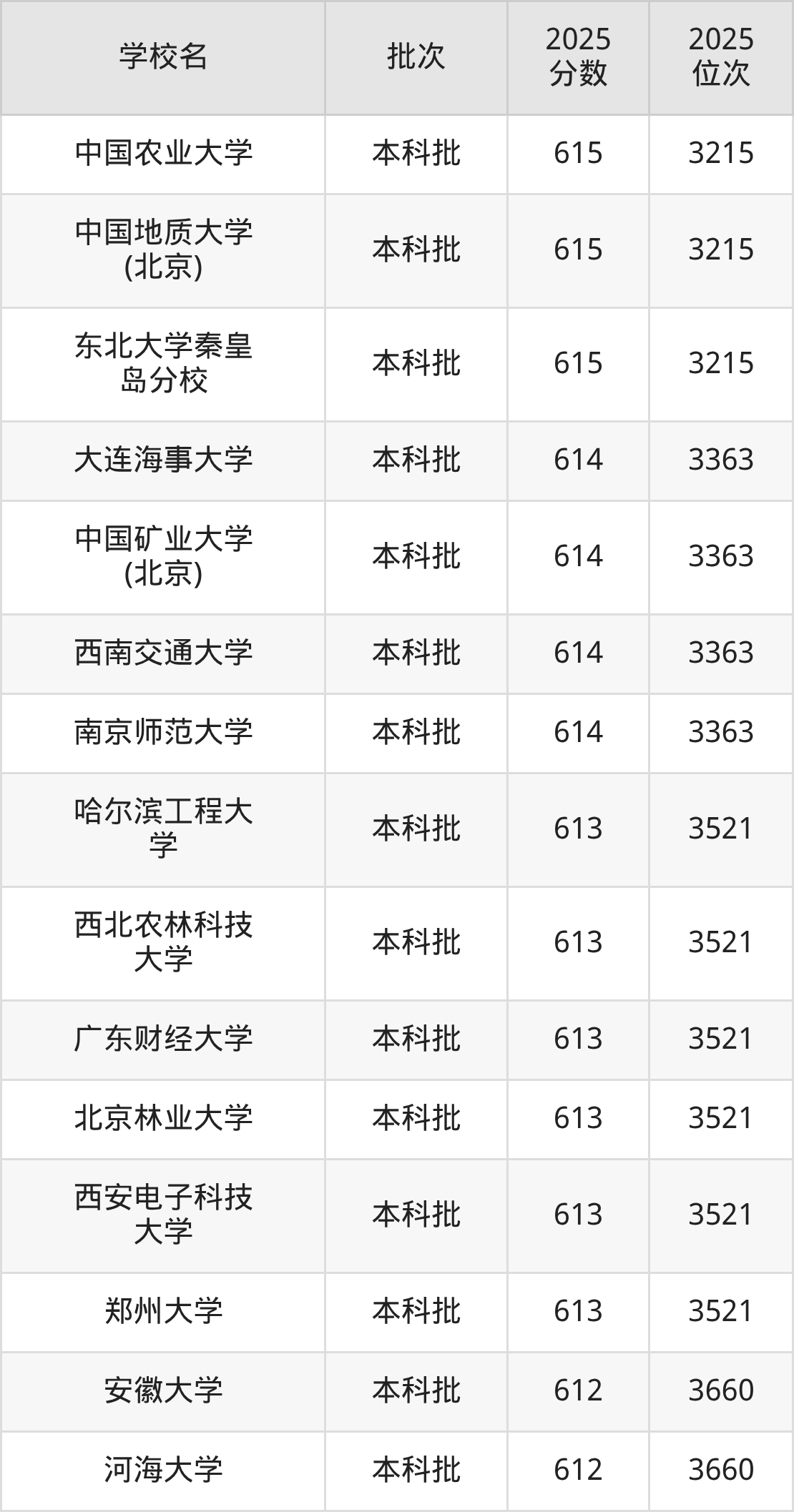 2025年河北高考历史类615分(3052名~3215名)能上的大学有东北大学秦皇岛分校、中国地质大学(北京)、中国农业大学、江南大学等。