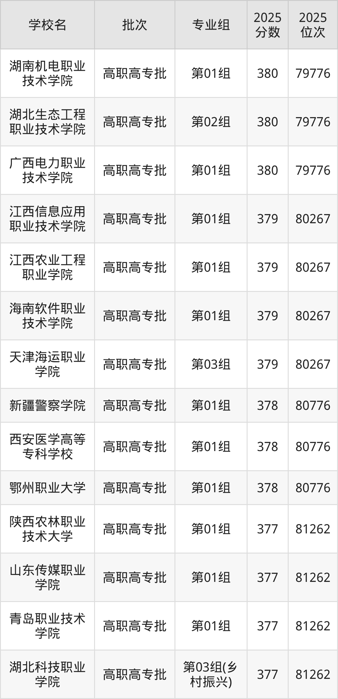 2025年湖北高考历史类378分(80268名~80776名)能上的大学有鄂州职业大学第01组、新疆警察学院第01组、西安医学高等专科学校第01组。