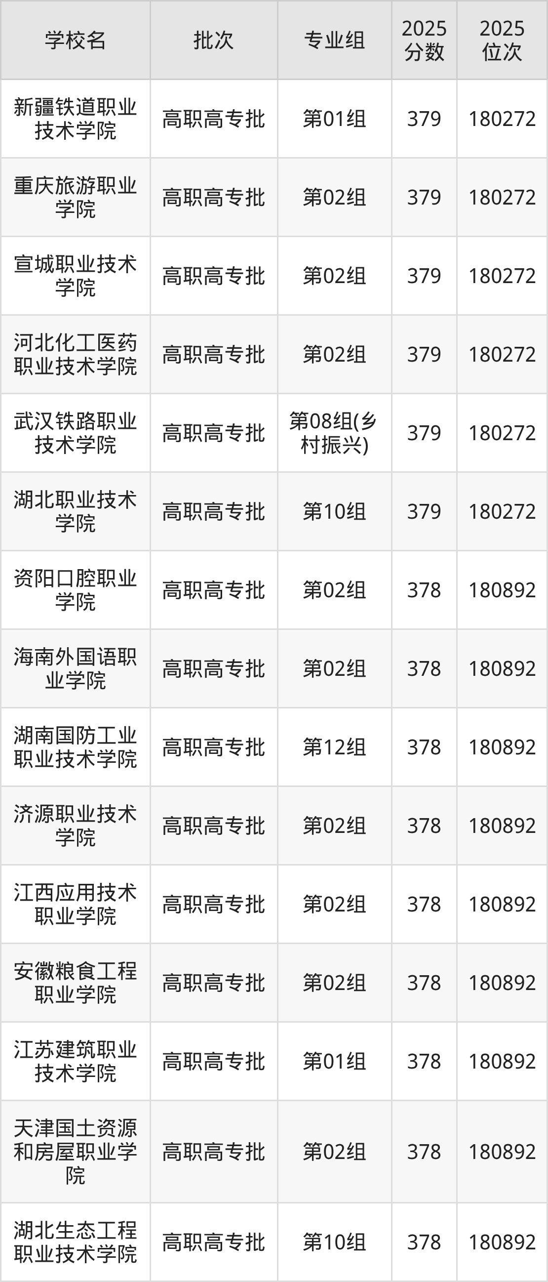 2025年湖北高考物理类378分(180273名~180892名)能上的大学有湖北生态工程职业技术学院第10组、天津国土资源和房屋职业学院第02组、江苏建筑职业技术学院第01组、安徽粮食工程职业学院第02组等。