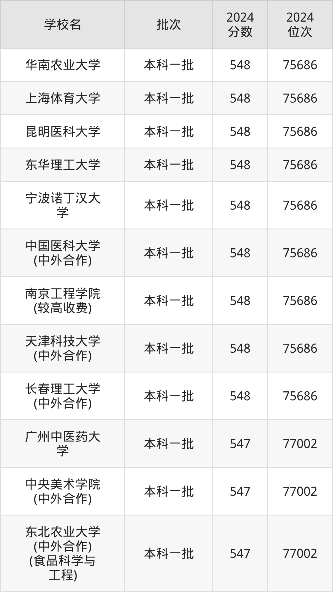 2024年河南高考理科547分(75687名~77002名)能上的大学有广州中医药大学、中央美术学院(中外合作)、东北农业大学(中外合作)(食品科学与工程)。