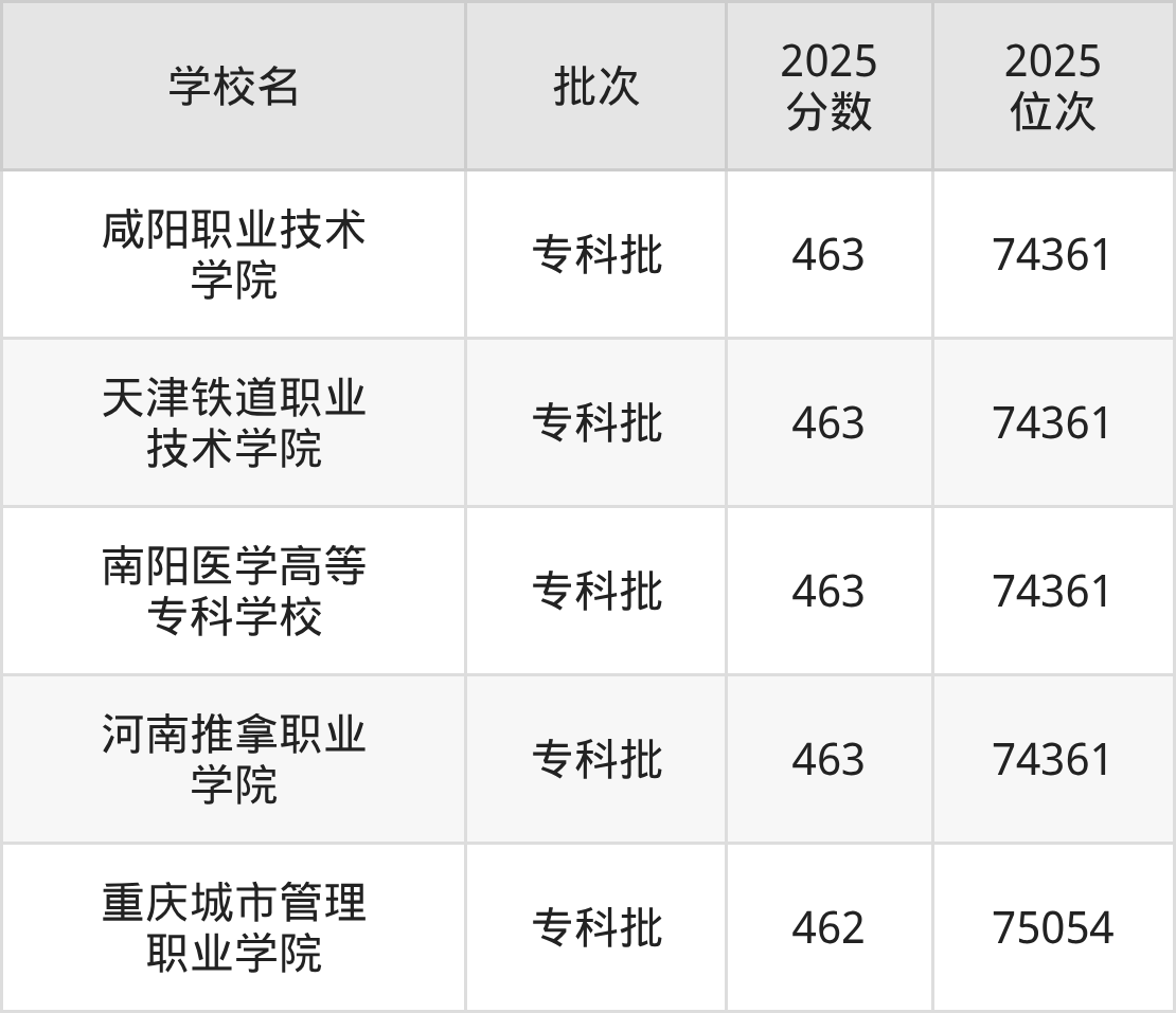 2025年河北高考历史类462分(74362名~75054名)能上的大学有重庆城市管理职业学院。
