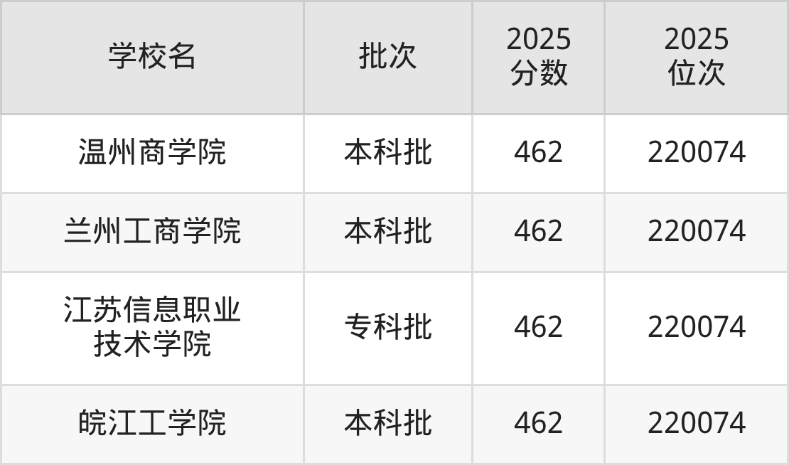 2025年河北高考物理类462分(218648名~220074名)能上的大学有皖江工学院、江苏信息职业技术学院、兰州工商学院、温州商学院等。