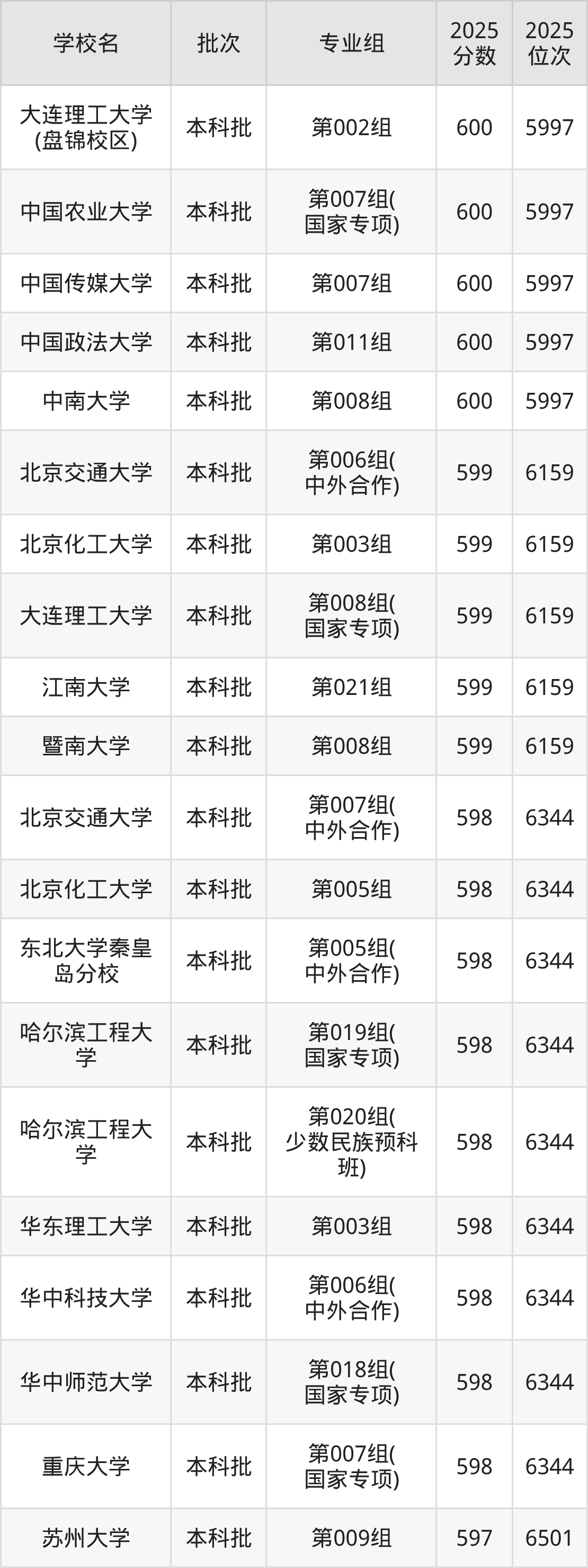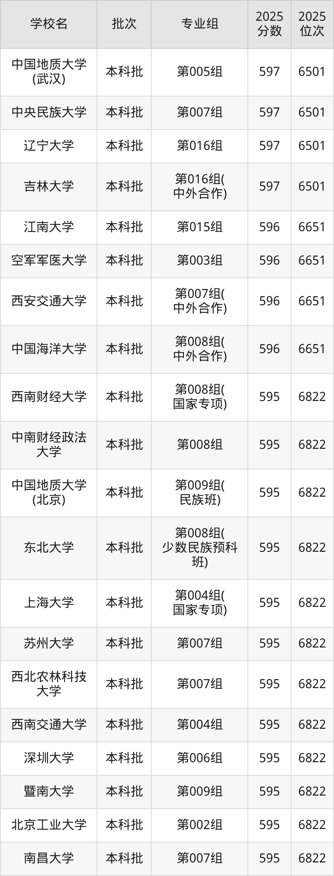 2025年黑龙江高考物理类597分(6345名~6501名)能上的大学有中央民族大学第007组、辽宁大学第016组、吉林大学第016组(中外合作)、苏州大学第009组等。