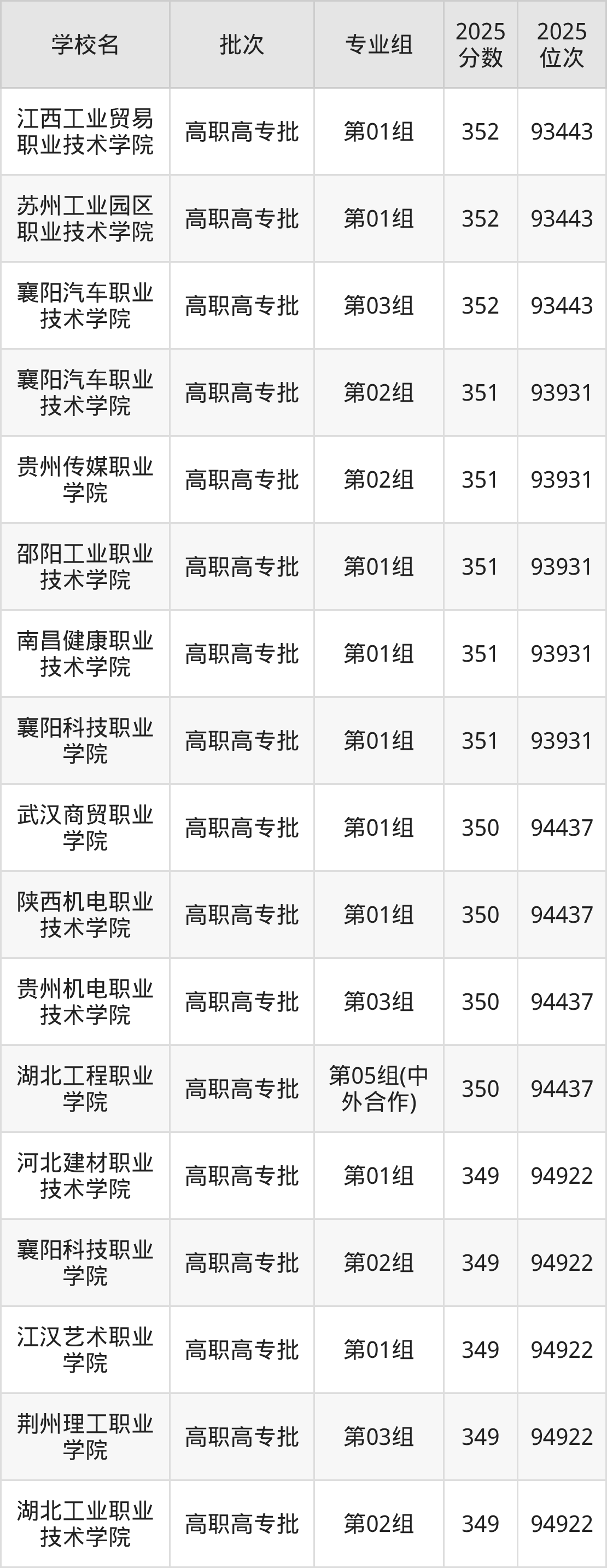 2025年湖北高考历史类350分(93932名~94437名)能上的大学有湖北工程职业学院第05组(中外合作)、武汉商贸职业学院第01组、贵州机电职业技术学院第03组、陕西机电职业技术学院第01组。