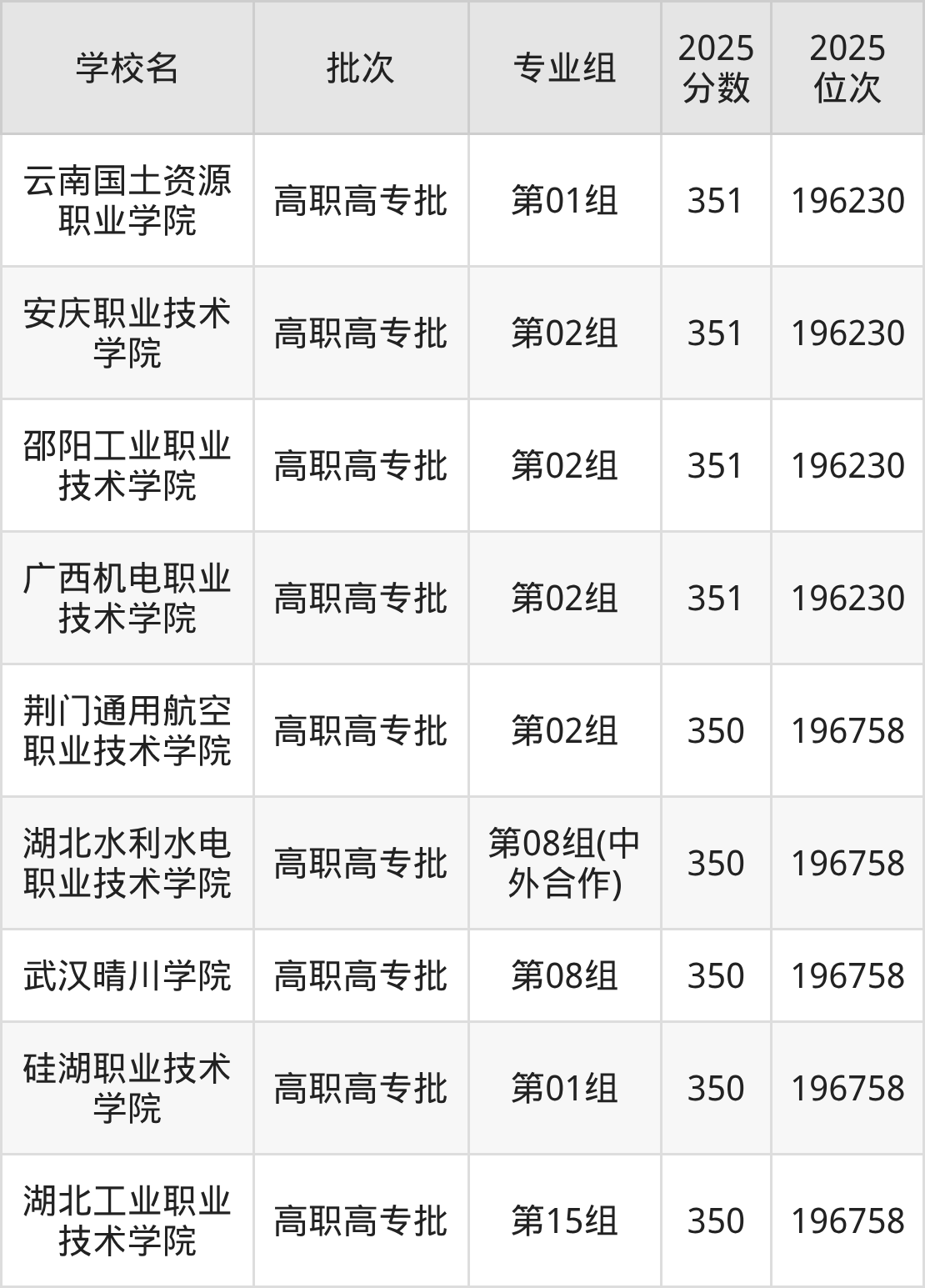 2025年湖北高考物理类350分(196231名~196758名)能上的大学有武汉晴川学院第08组、湖北工业职业技术学院第15组、湖北水利水电职业技术学院第08组(中外合作)、荆门通用航空职业技术学院第02组等。