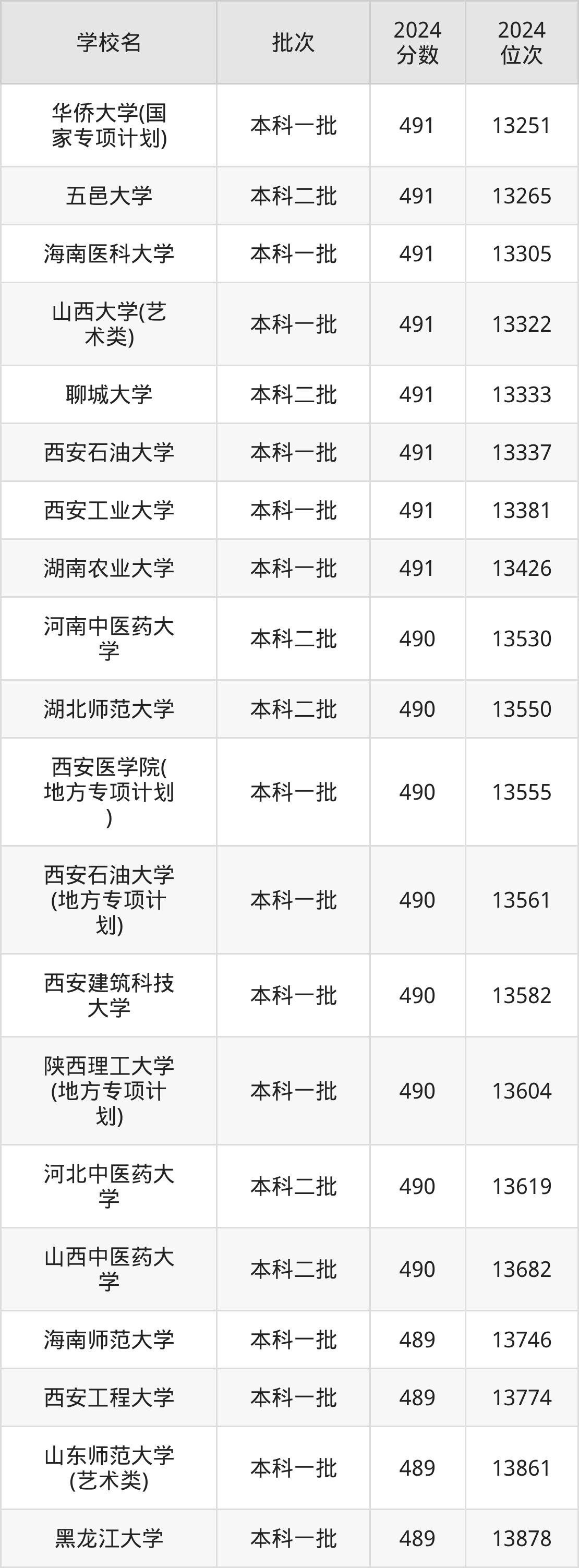 2024年陕西高考文科489分(13723名~13994名)能上的大学有黑龙江大学、广东金融学院、海南师范大学、四川警察学院等。