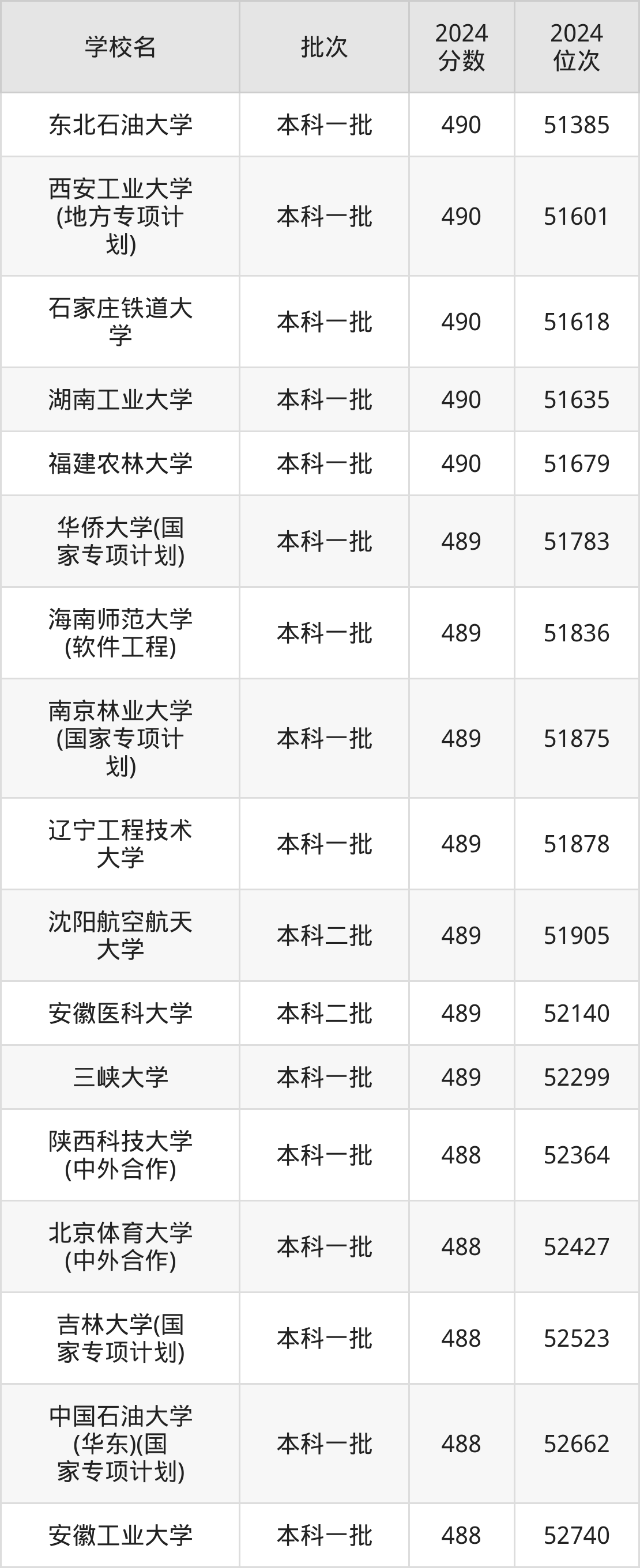 另外录取位次低于该区间(较稳妥)的有陕西科技大学(中外合作)(52364名)、北京体育大学(中外合作)(52427名)等;录取位次高于该区间(可冲)的有福建农林大学(51679名)、湖南工业大学(51635名)等。