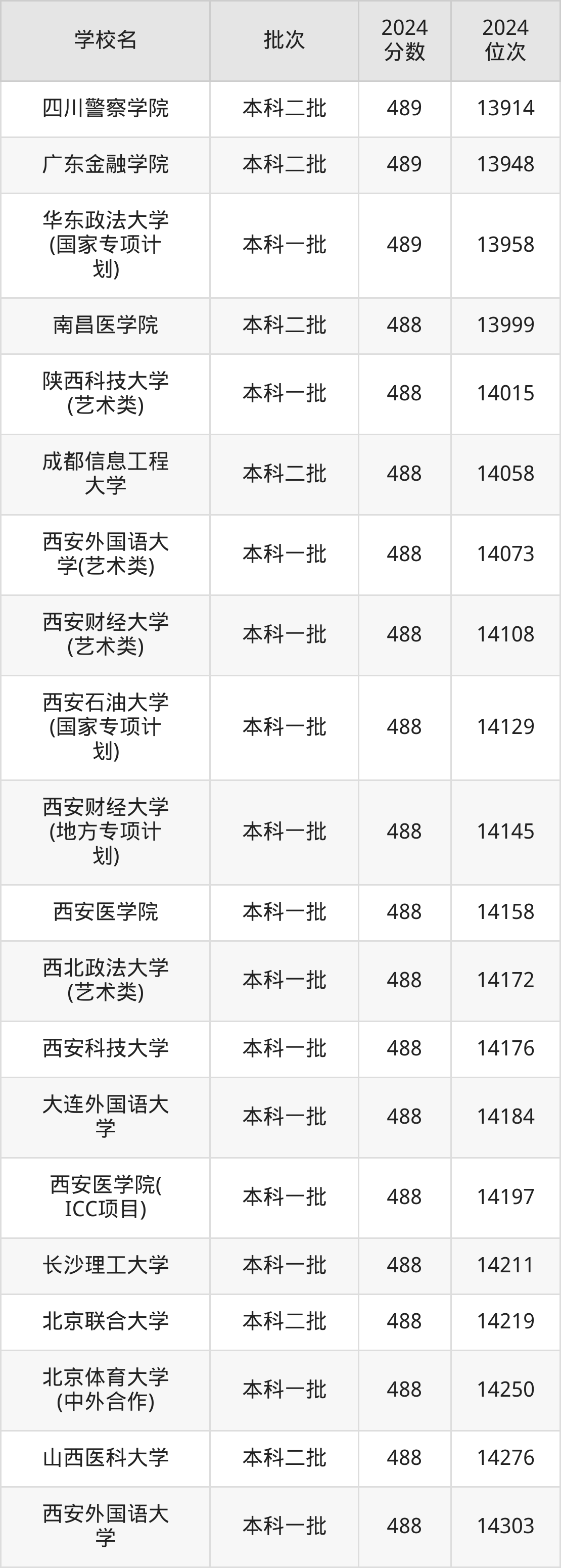 陕西高考489分:文科排名13994位、理科排名52358位。该分数位次对应能上的大学文科有黑龙江大学、广东金融学院;理科有沈阳航空航天大学、辽宁工程技术大学,更多名单如下文所示,2025届考生可参考。