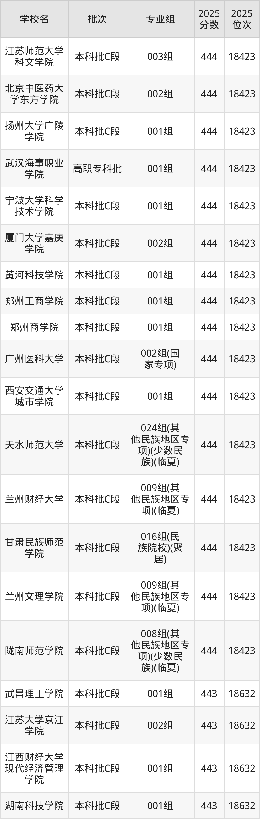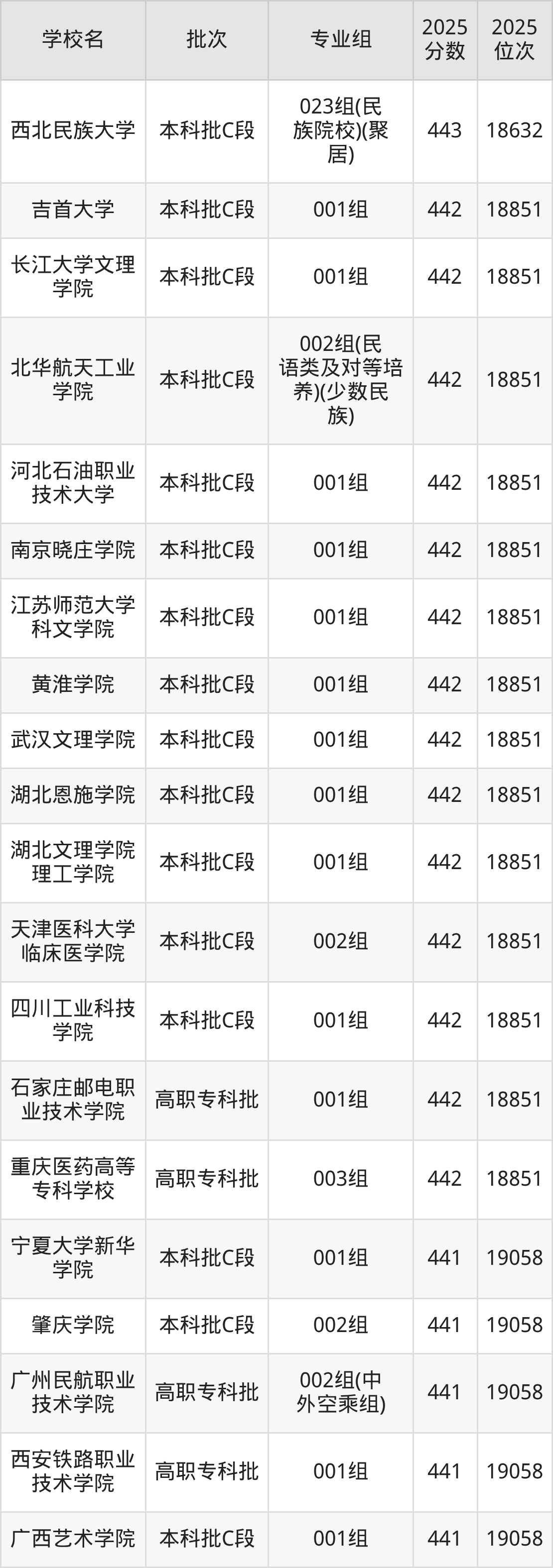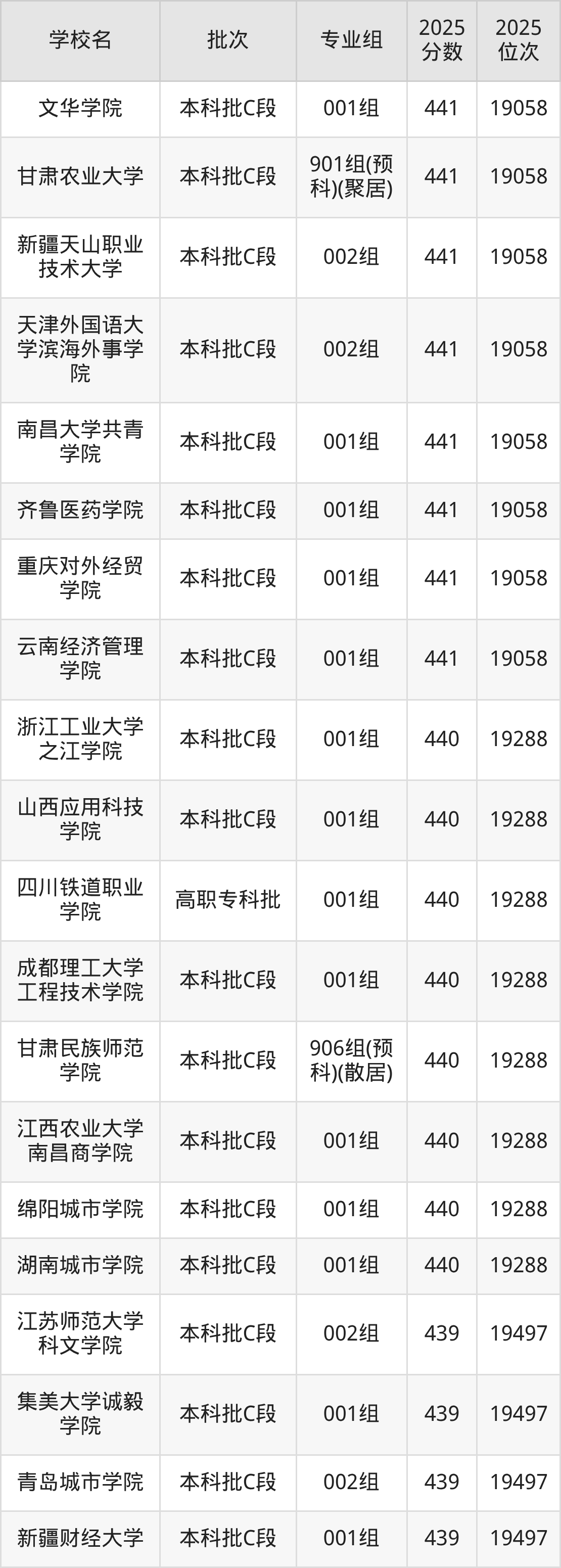 2025年甘肃高考历史类441分(18852名~19058名)能上的大学有天津外国语大学滨海外事学院002组、南昌大学共青学院001组、齐鲁医药学院001组、文华学院001组等。