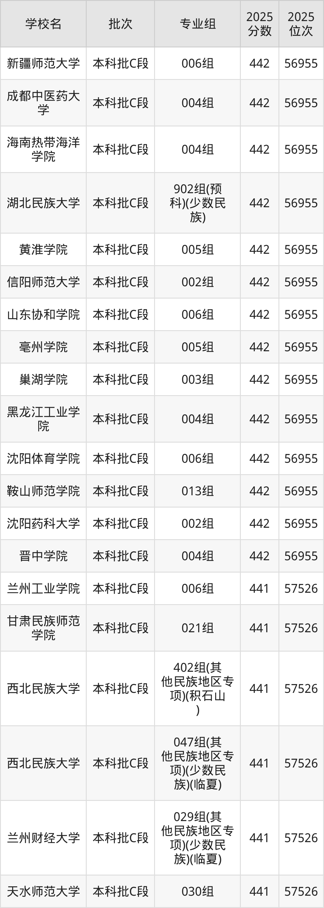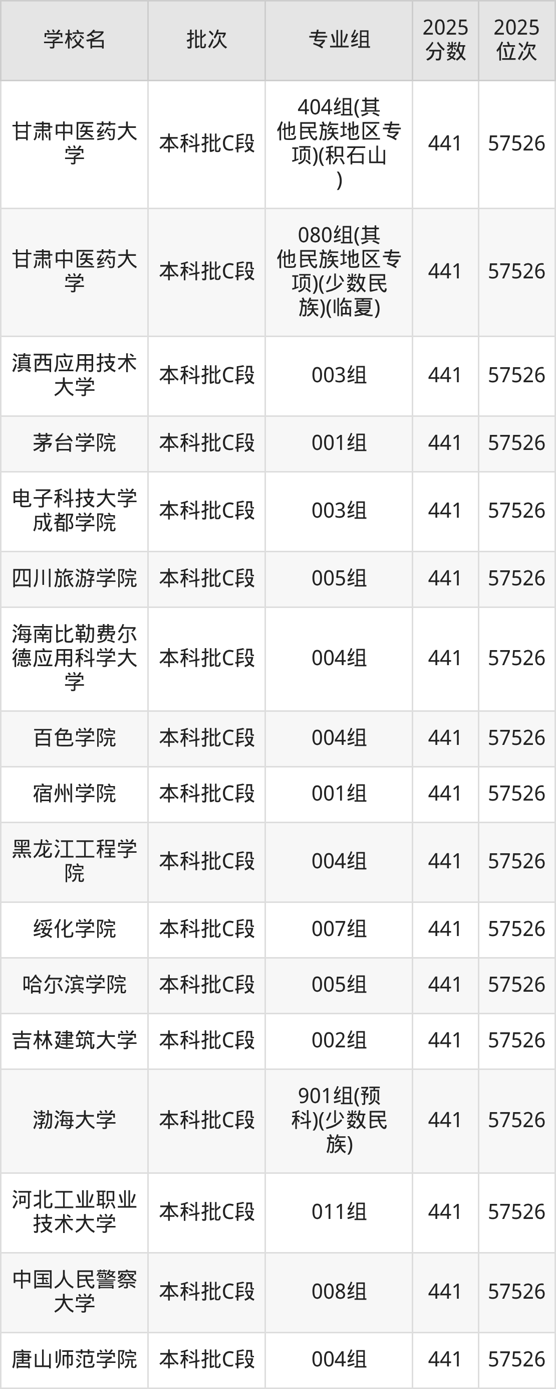 2025年甘肃高考物理类441分(56956名~57526名)能上的大学有唐山师范学院004组、中国人民警察大学008组、河北工业职业技术大学011组、渤海大学901组(预科)(少数民族)等。