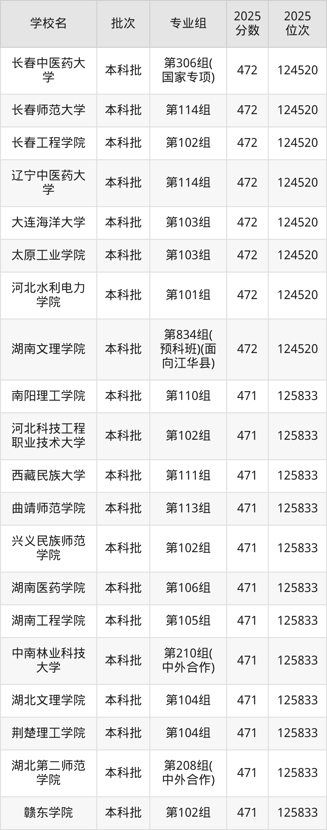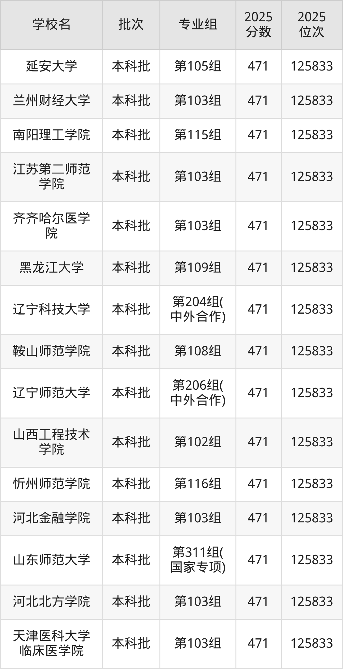 2025年湖南高考物理类471分(124521名~125833名)能上的大学有天津医科大学临床医学院第103组、河北北方学院第103组、河北科技工程职业技术大学第102组、河北金融学院第103组等。