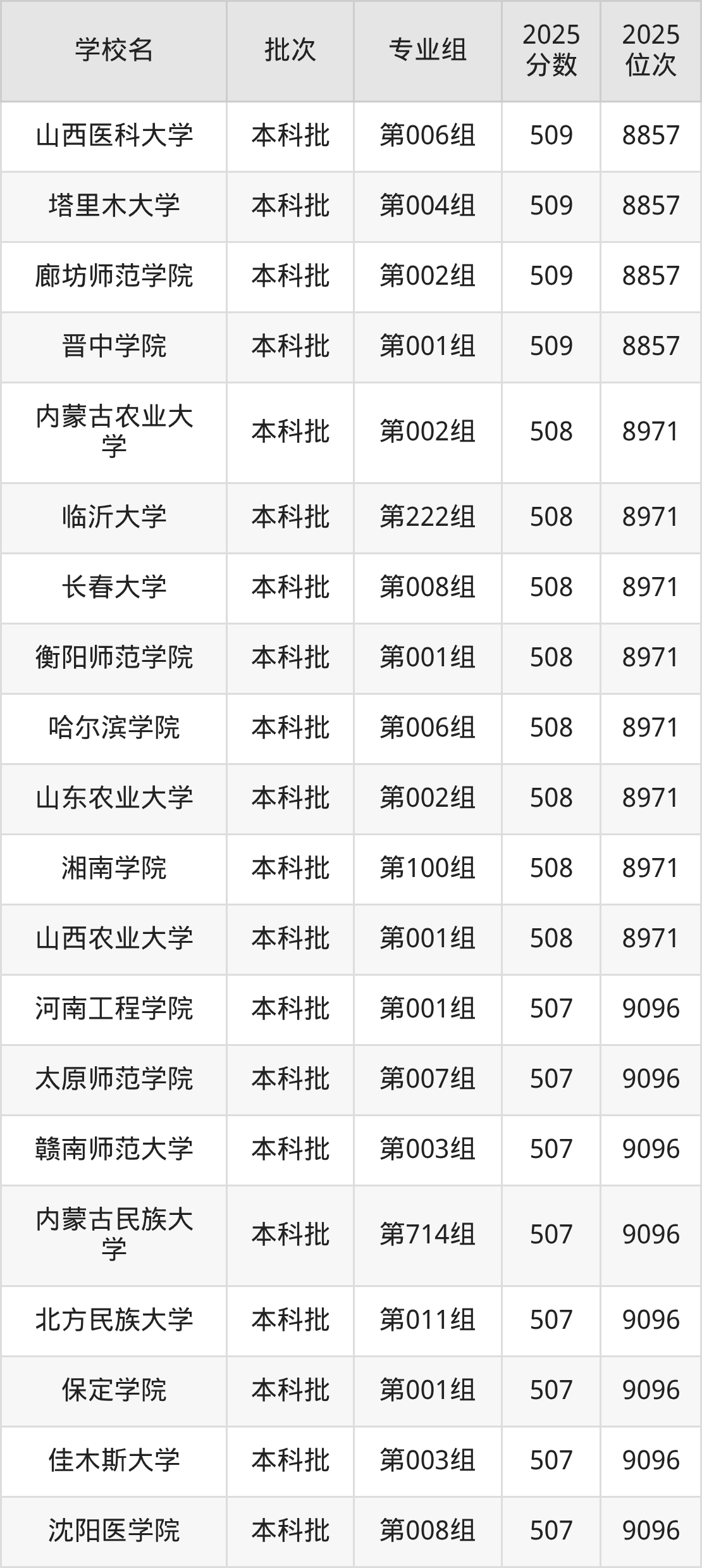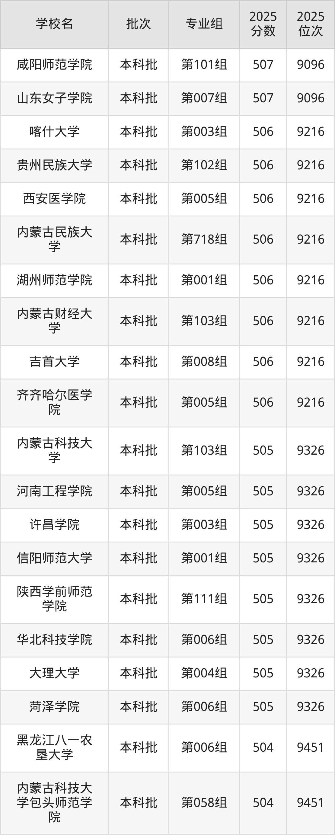 2025年内蒙古高考历史类506分(9097名~9216名)能上的大学有吉首大学第008组、贵州民族大学第102组、内蒙古民族大学第718组、喀什大学第003组等。