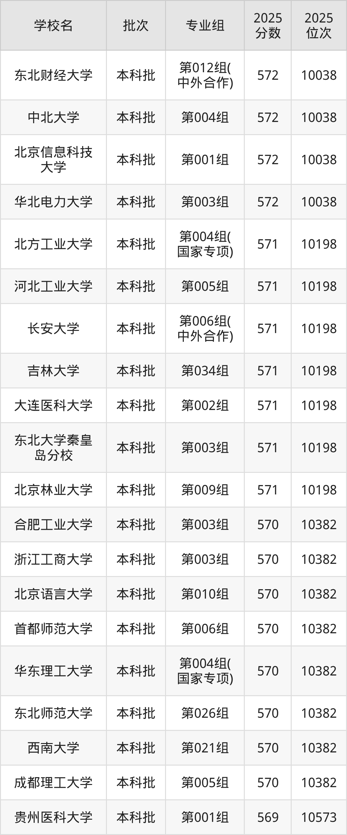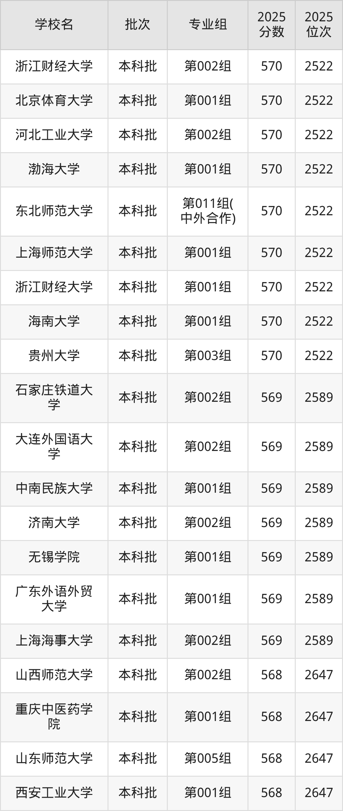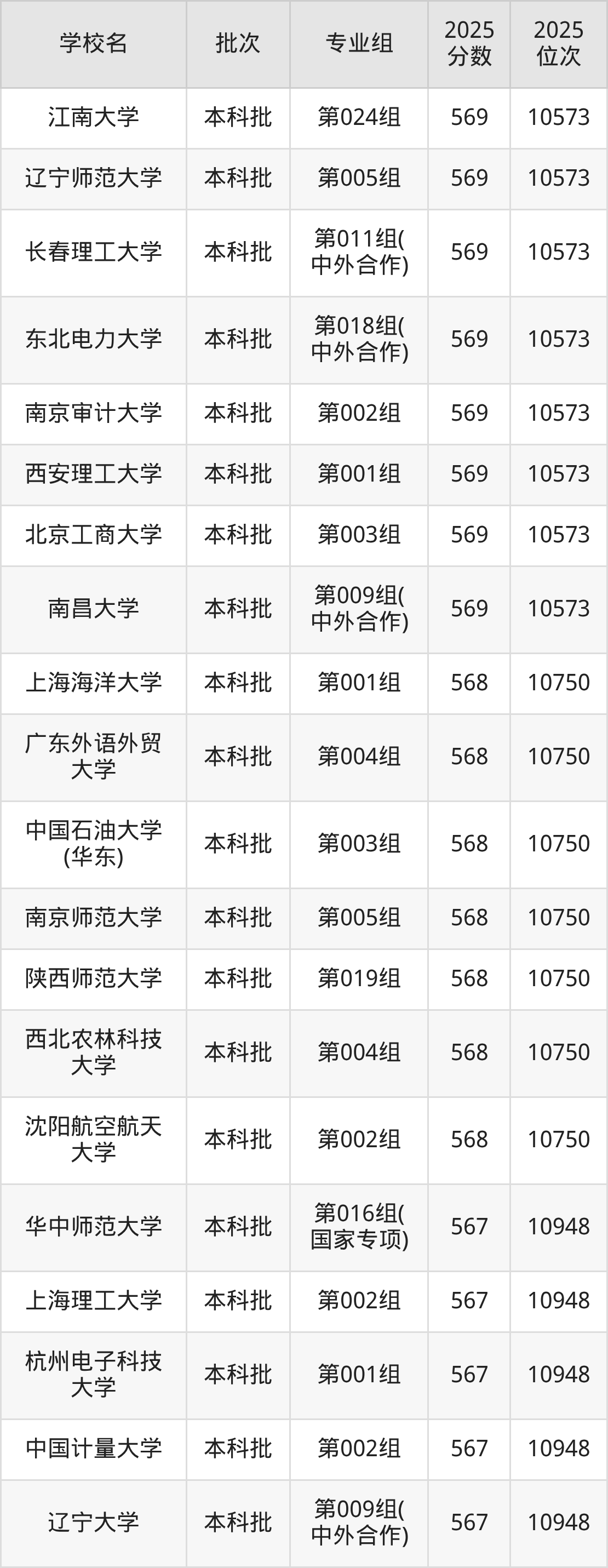 2025年吉林高考物理类569分(10383名~10573名)能上的大学有北京工商大学第003组、辽宁师范大学第005组、长春理工大学第011组(中外合作)、东北电力大学第018组(中外合作)等。