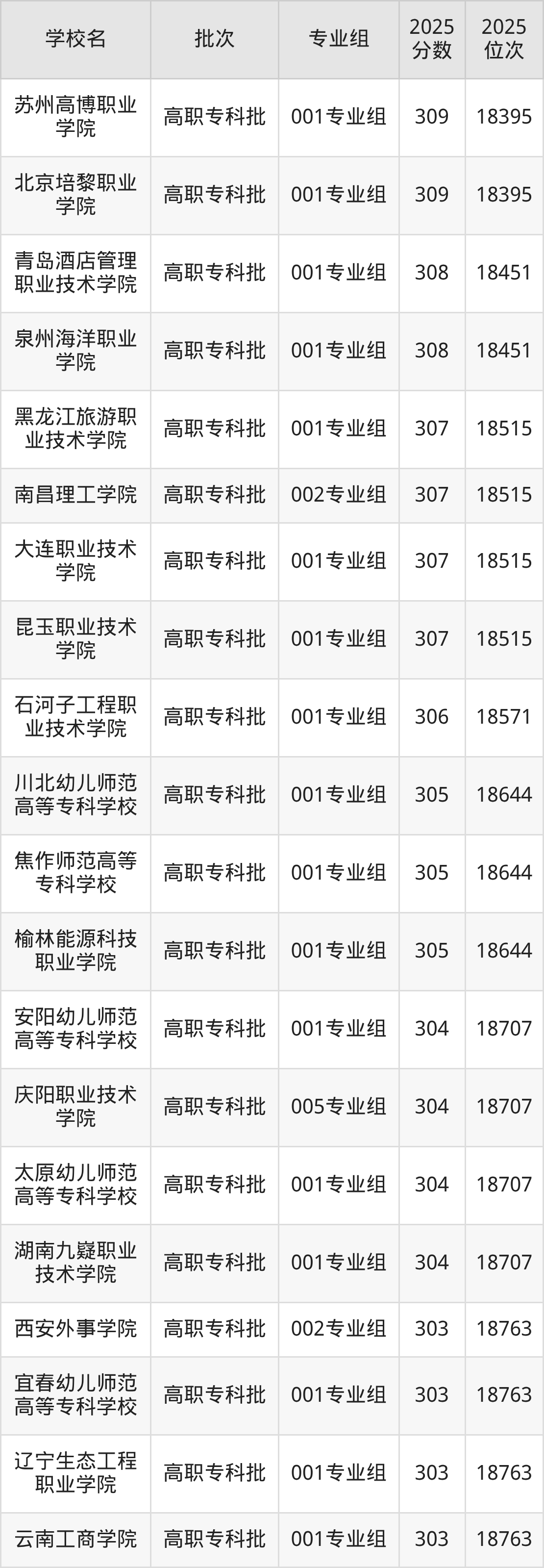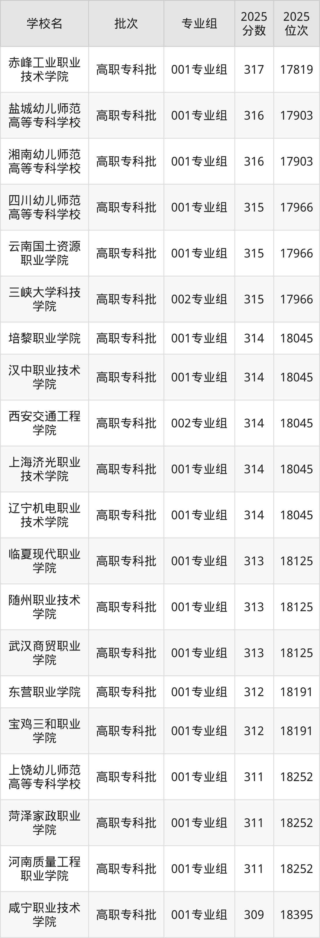 2025年宁夏高考历史类310分(18253名~18327名)录取位次低于该区间(较稳妥)的有咸宁职业技术学院001专业组(18395名)、北京培黎职业学院001专业组(18395名)等;录取位次高于该区间(可冲)的有河南质量工程职业学院001专业组(18252名)、菏泽家政职业学院001专业组(18252名)等。
