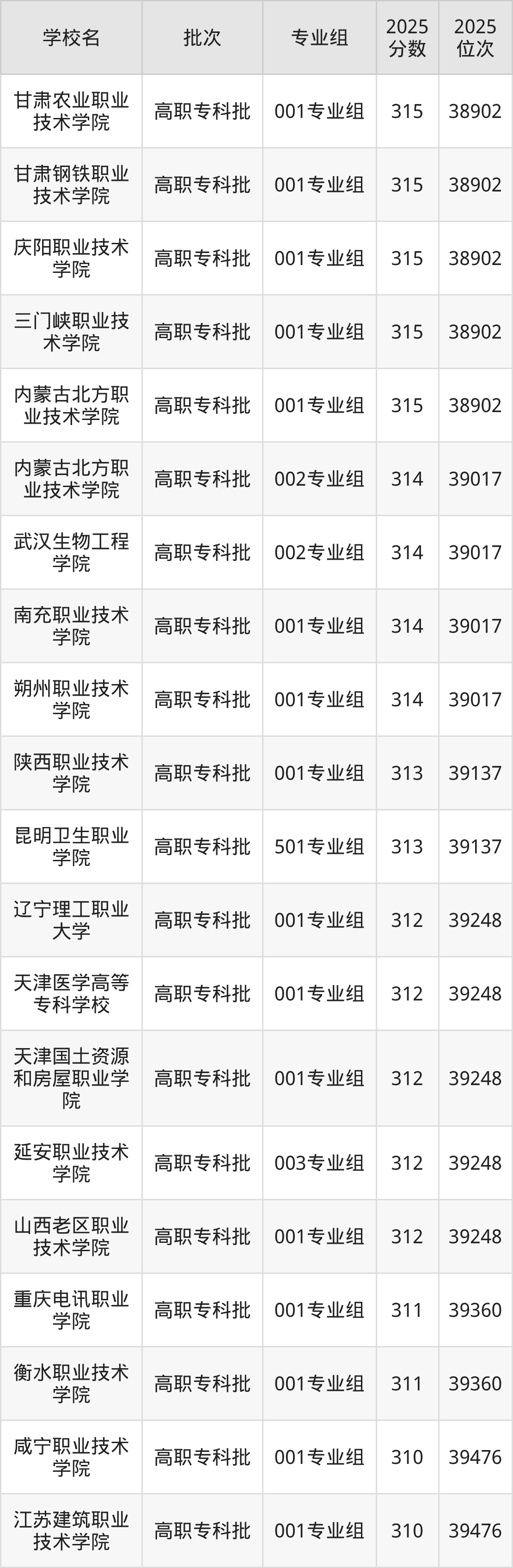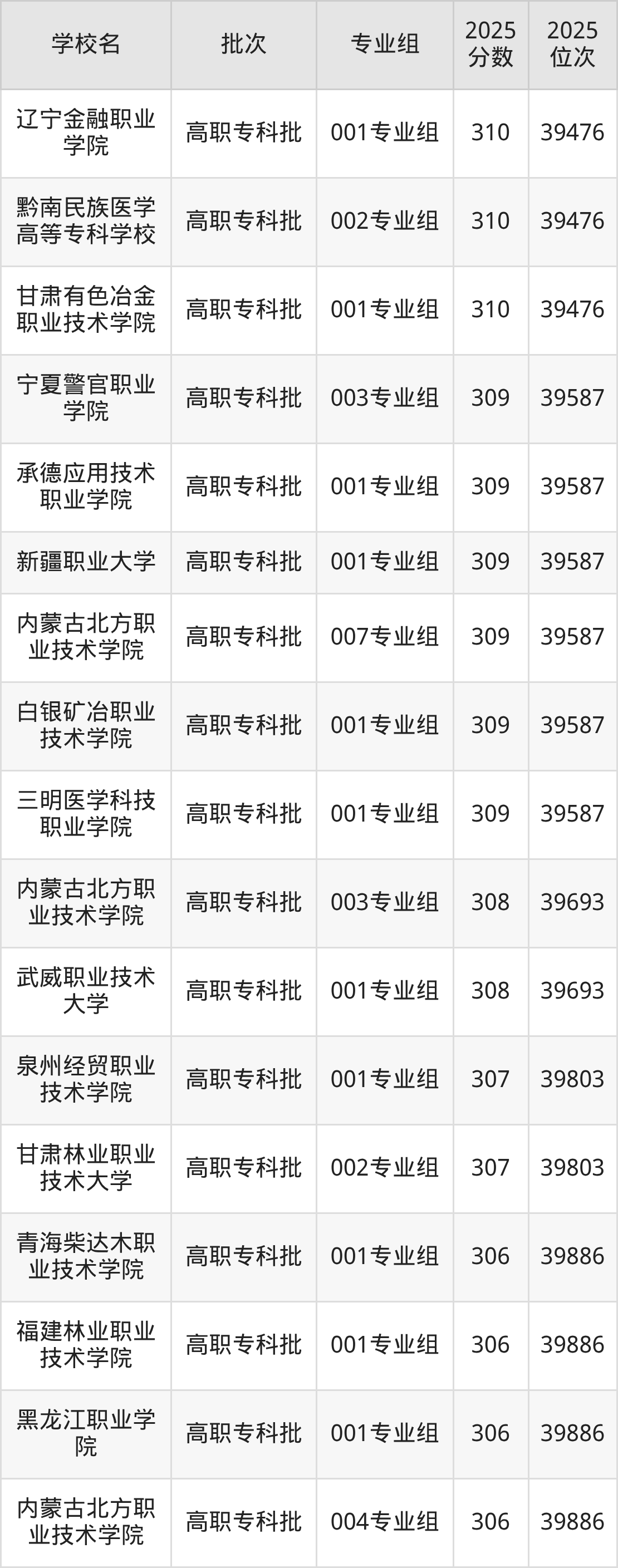 2025年宁夏高考物理类310分(39361名~39476名)能上的大学有辽宁金融职业学院001专业组、江苏建筑职业技术学院001专业组、咸宁职业技术学院001专业组、黔南民族医学高等专科学校002专业组等。
