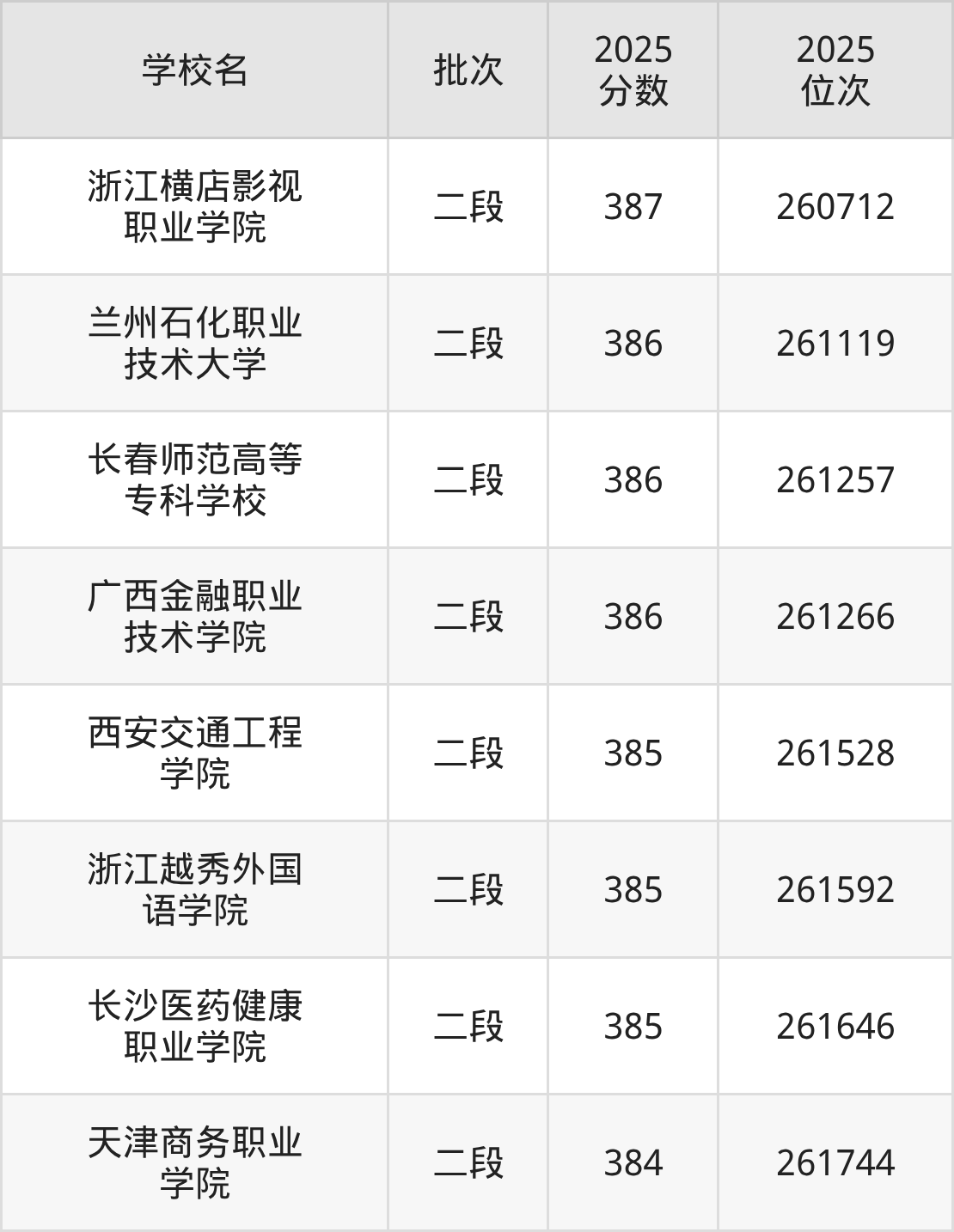 2025年浙江高考386分(260881名~261338名)能上的大学有兰州石化职业技术大学、长春师范高等专科学校、广西金融职业技术学院。