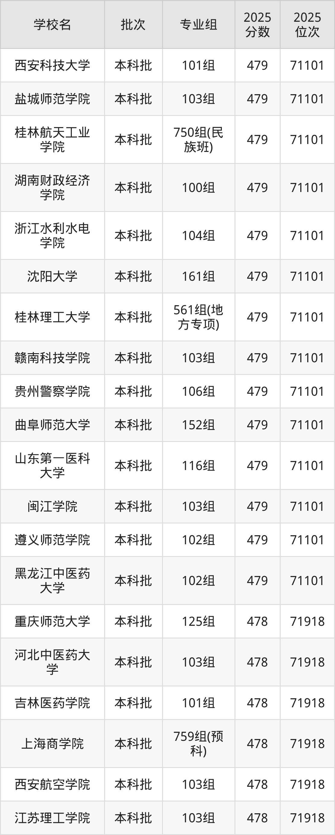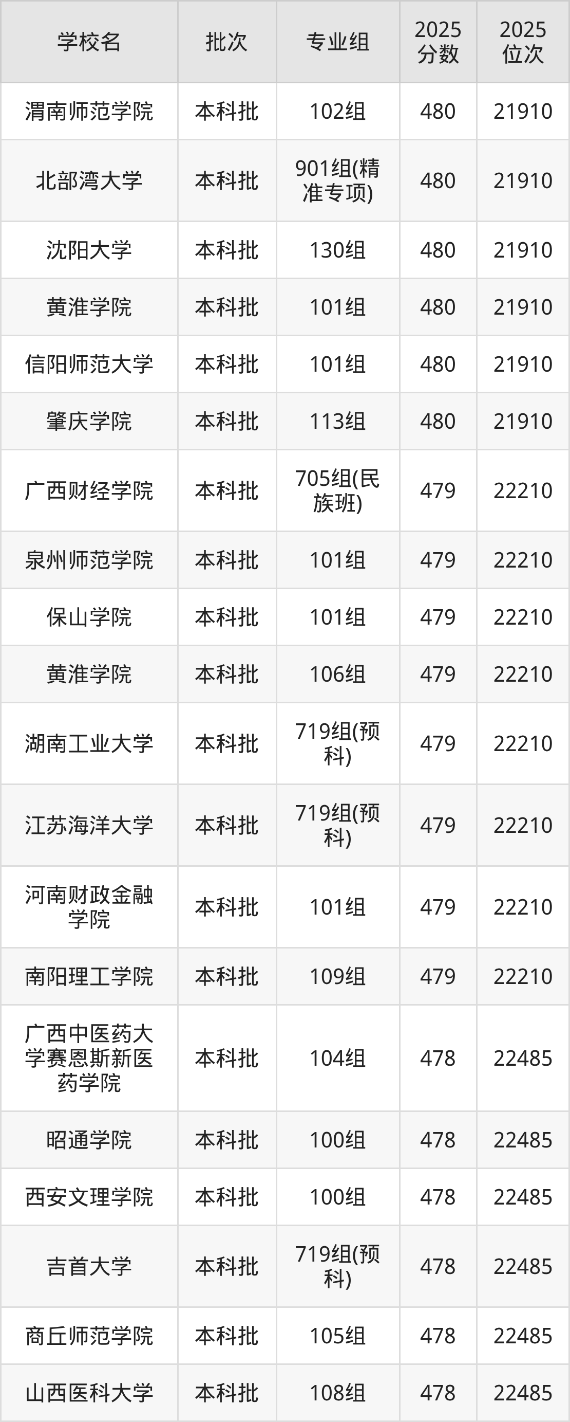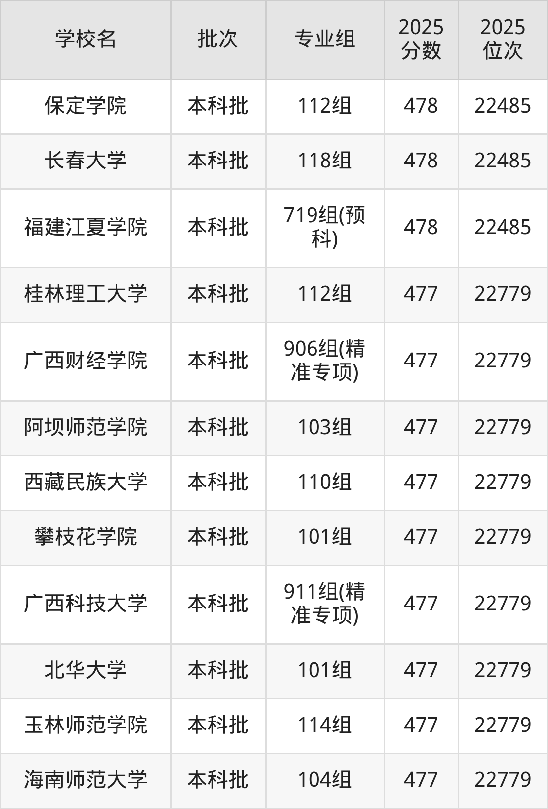 2025年广西高考历史类478分(22211名~22485名)能上的大学有保定学院112组、山西医科大学108组、商丘师范学院105组、吉首大学719组(预科)等。