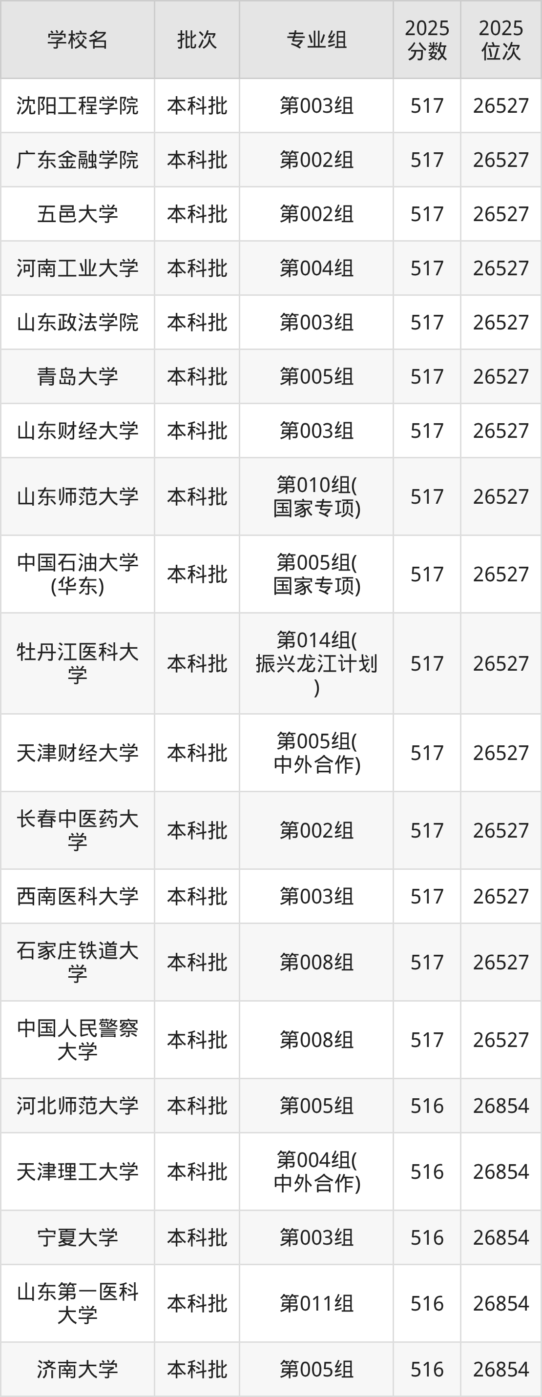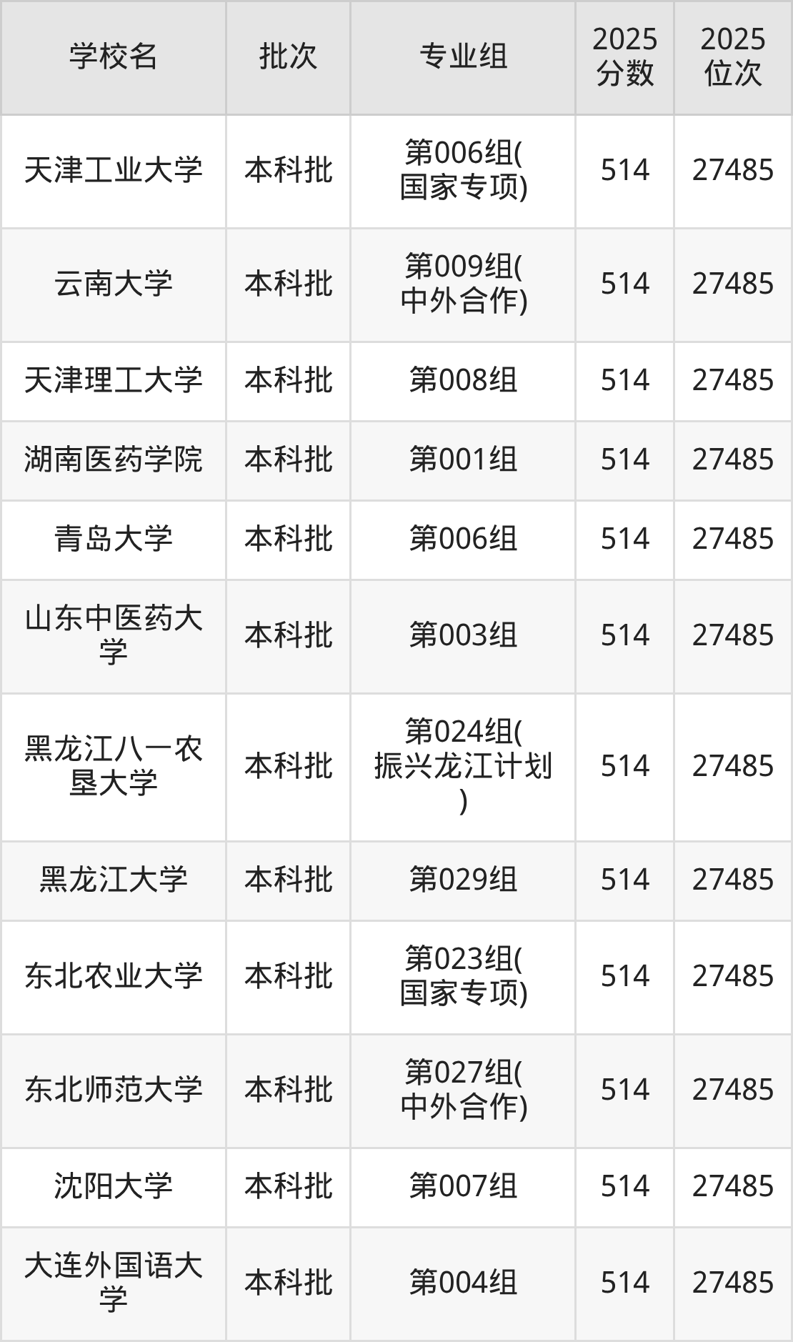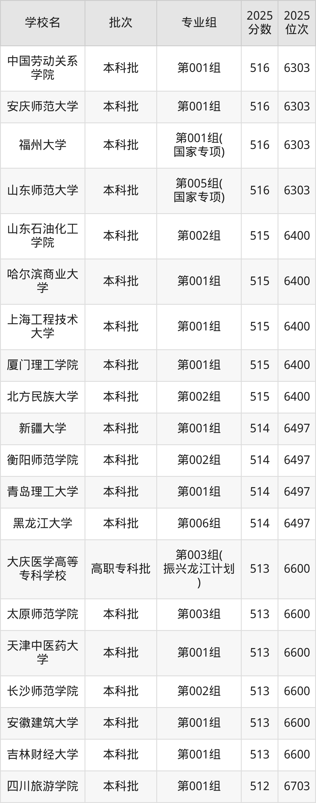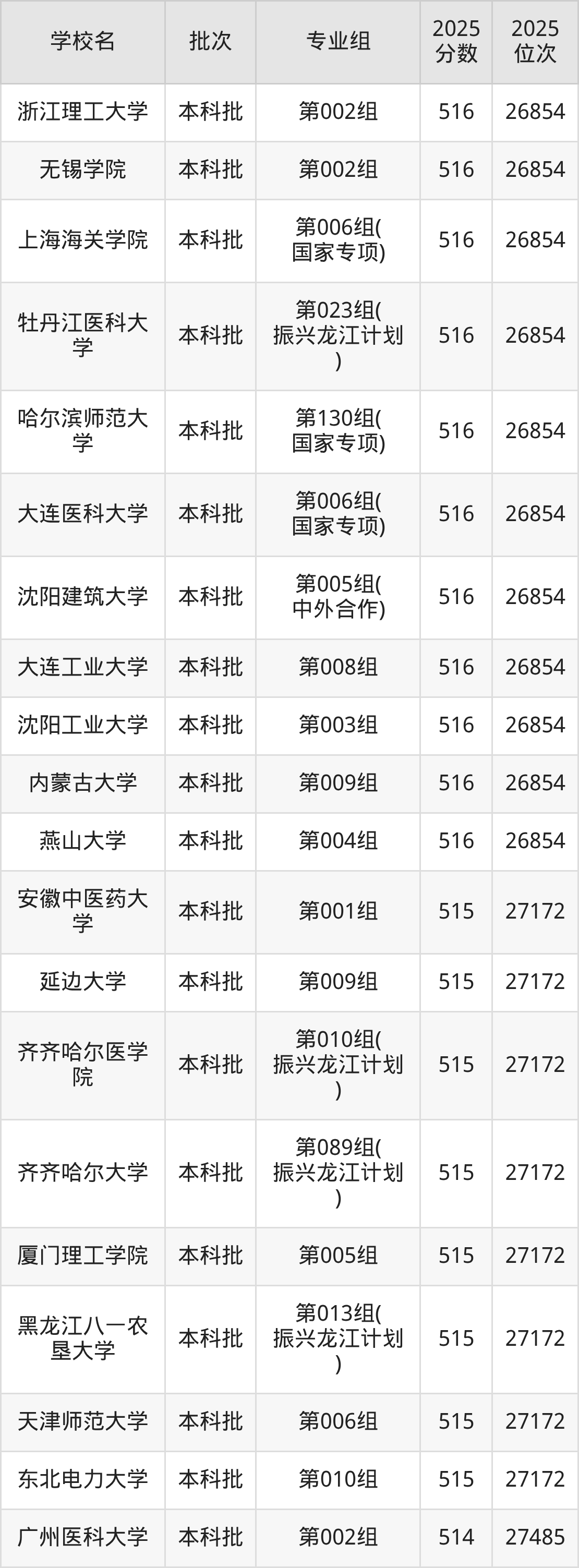 2025年黑龙江高考物理类515分(26855名~27172名)能上的大学有天津师范大学第006组、延边大学第009组、东北电力大学第010组、黑龙江八一农垦大学第013组(振兴龙江计划)等。