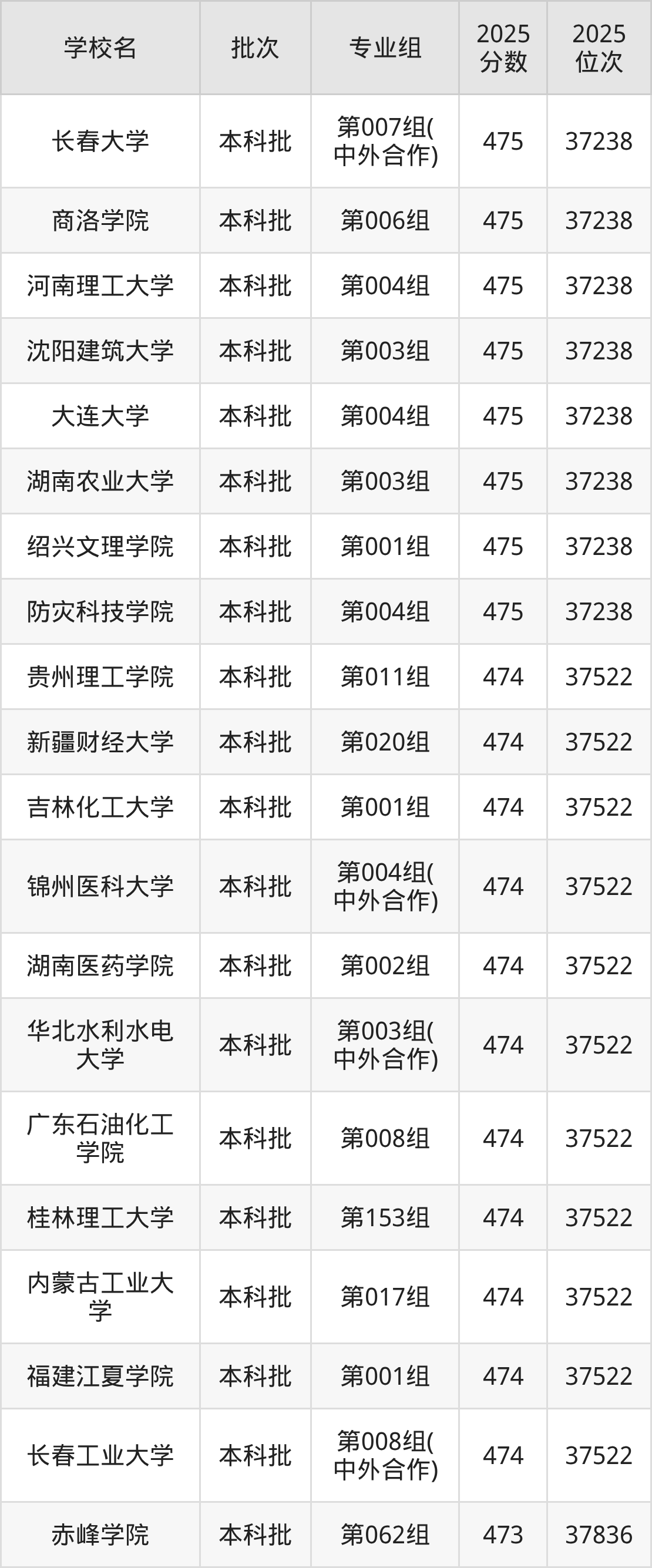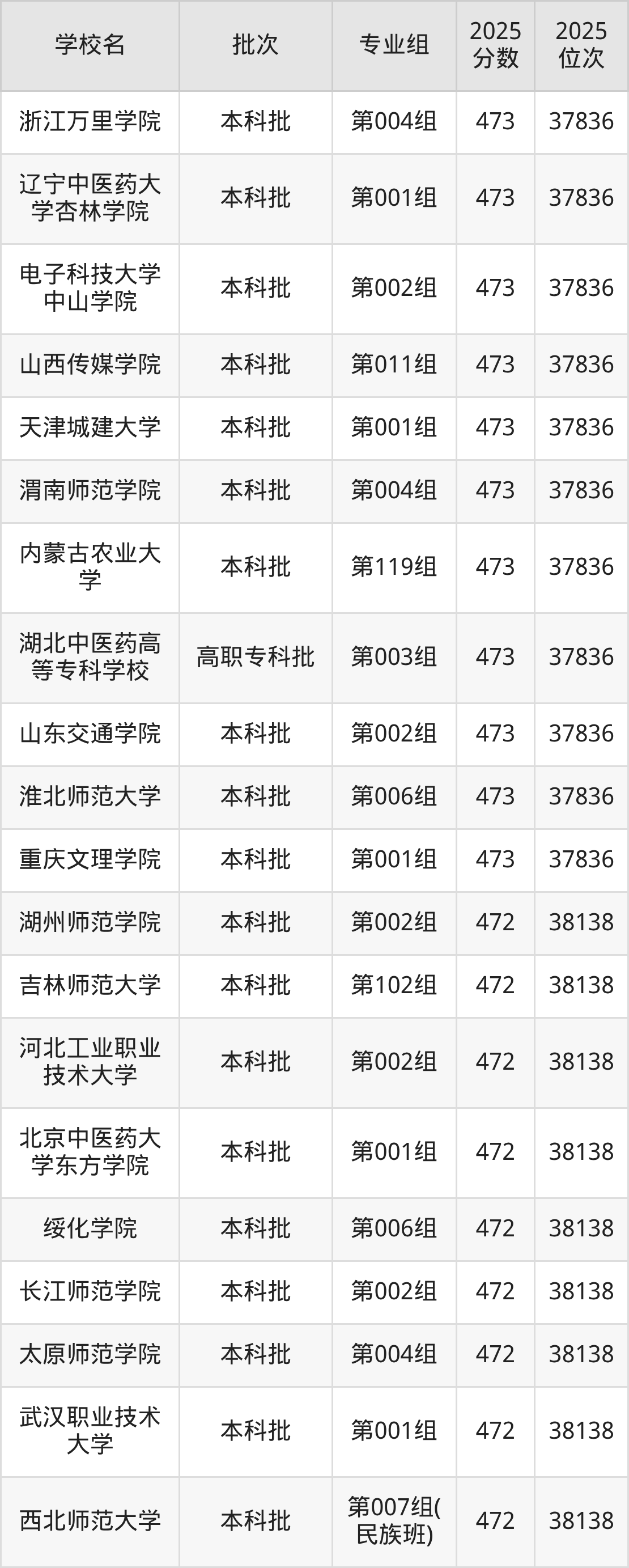 2025年内蒙古高考物理类473分(37523名~37836名)能上的大学有重庆文理学院第001组、淮北师范大学第006组、山东交通学院第002组、湖北中医药高等专科学校第003组等。