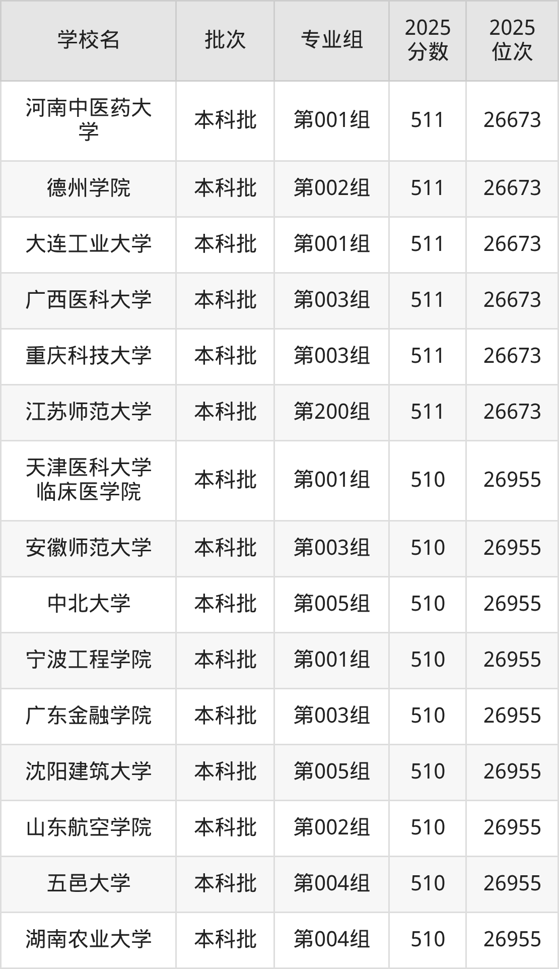 另外录取位次低于该区间(较稳妥)的有山东航空学院第002组(26955名)、五邑大学第004组(26955名)等;录取位次高于该区间(可冲)的有大连海洋大学第003组(26380名)、山西医科大学第003组(26380名)等。