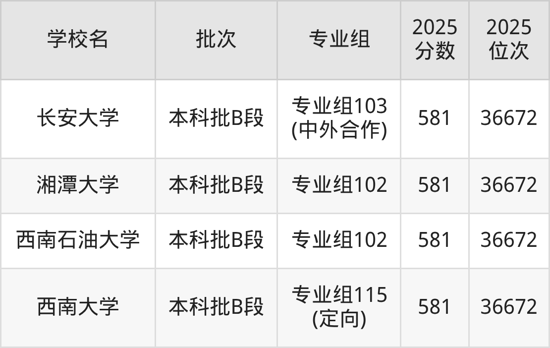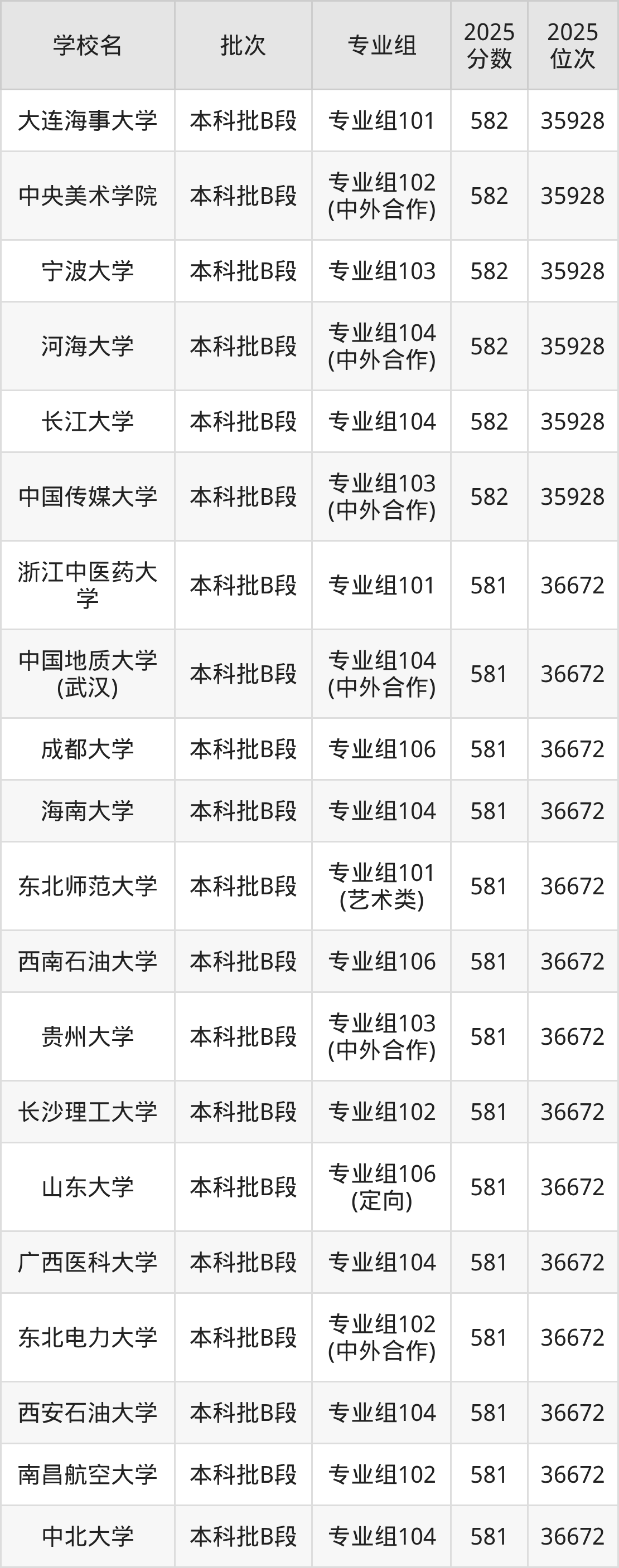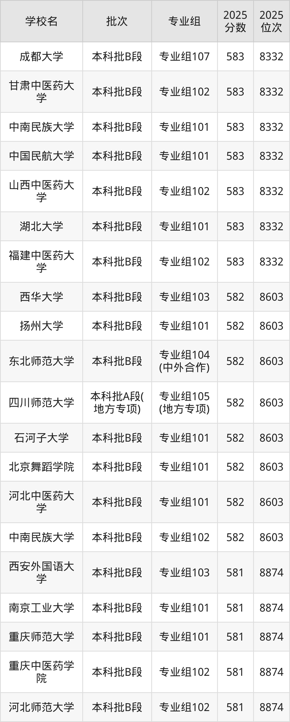 2025年四川高考物理类581分(35929名~36672名)能上的大学有成都大学专业组106、海南大学专业组104、东北师范大学专业组101(艺术类)、西南石油大学专业组106等。