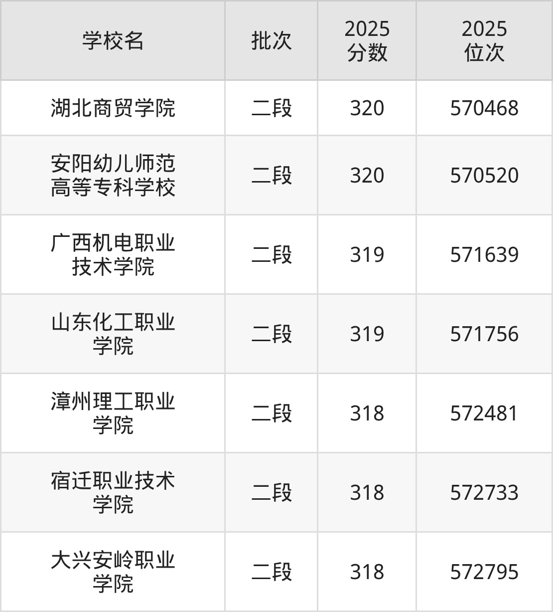 这些都是2026年高考570818名~572398名考生可以报考的大学,更多学校名单如下表所示: