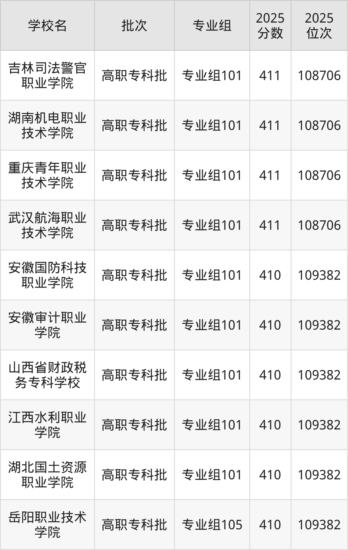 2025年四川高考历史类410分(108707名~109382名)能上的大学有湖北国土资源职业学院专业组101、岳阳职业技术学院专业组105、安徽国防科技职业学院专业组101、江西水利职业学院专业组101等。