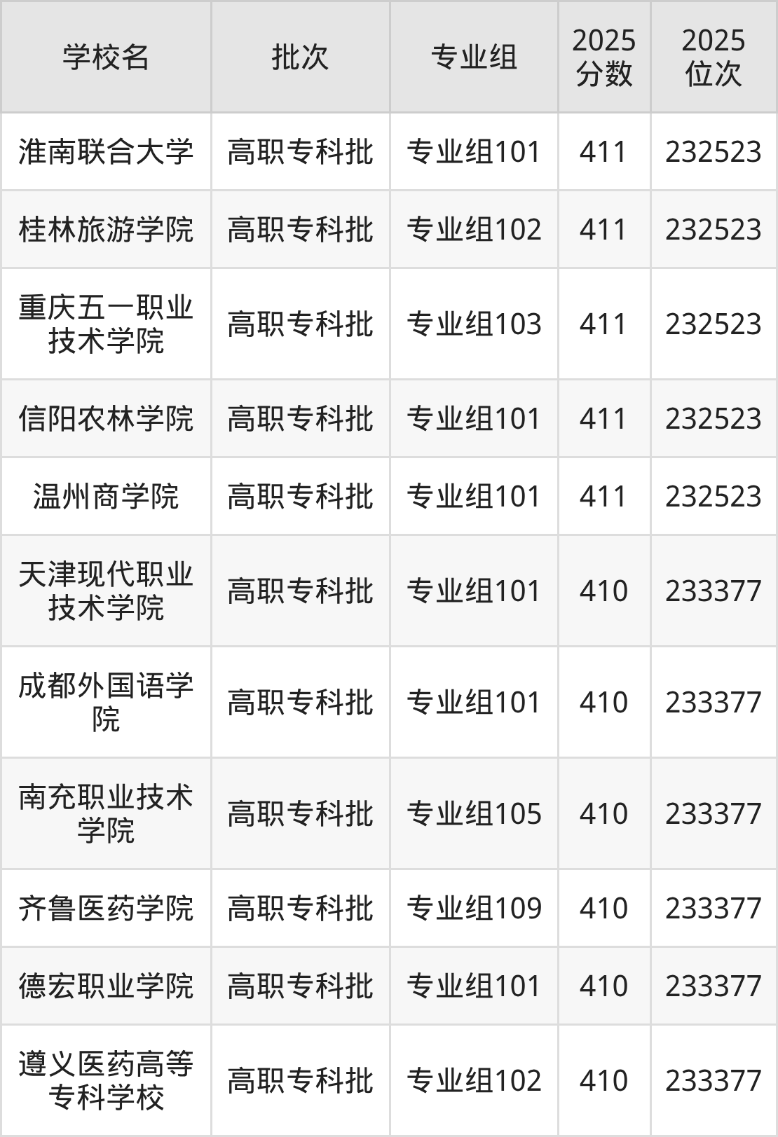2025年四川高考物理类410分(232524名~233377名)能上的大学有德宏职业学院专业组101、遵义医药高等专科学校专业组102、齐鲁医药学院专业组109、成都外国语学院专业组101等。