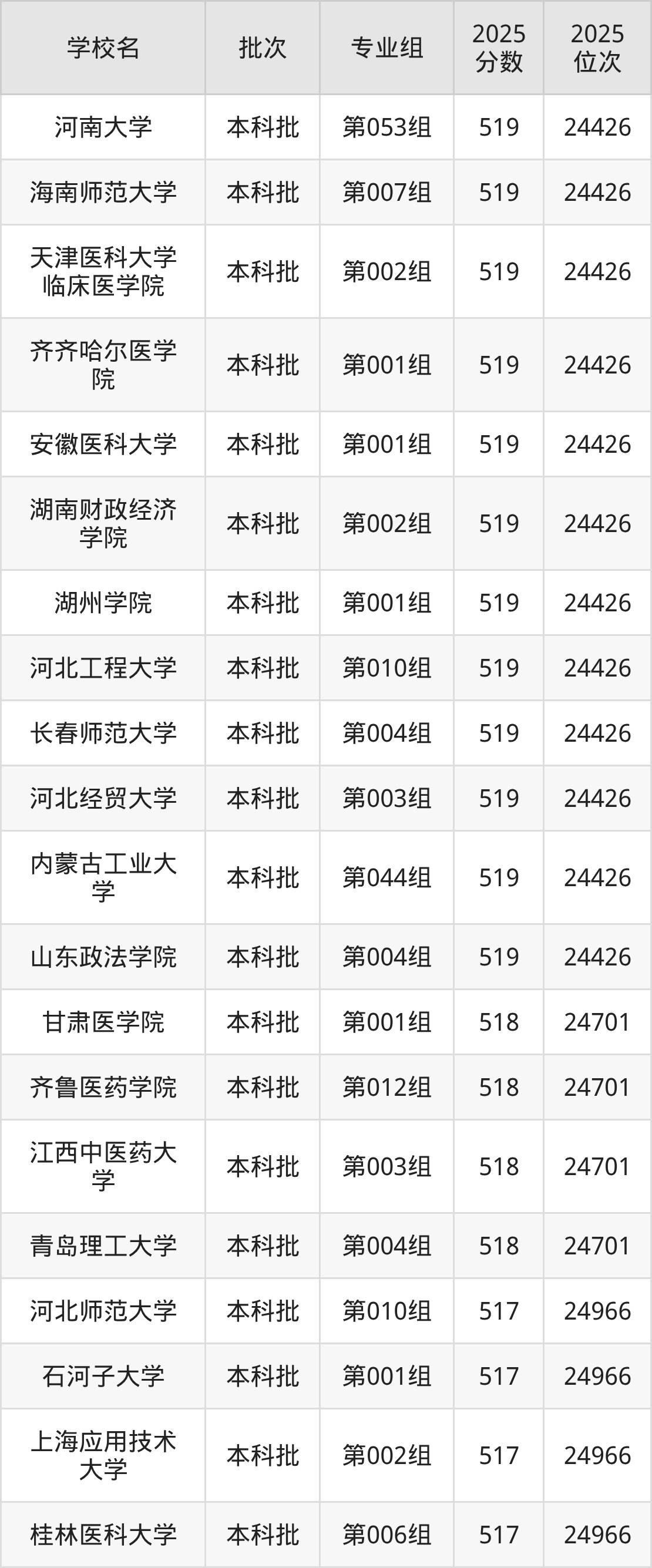 2025年内蒙古高考物理类517分(24702名~24966名)能上的大学有河北医科大学第002组、河北师范大学第005组、哈尔滨理工大学第002组、太原科技大学第001组等。