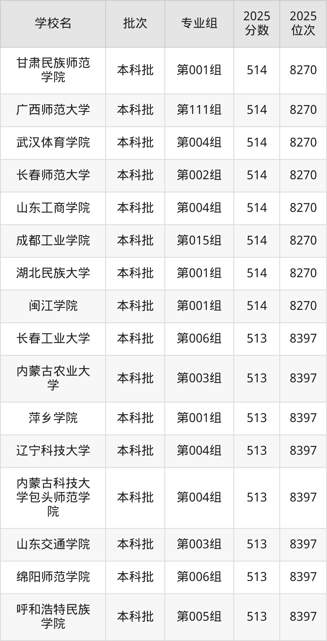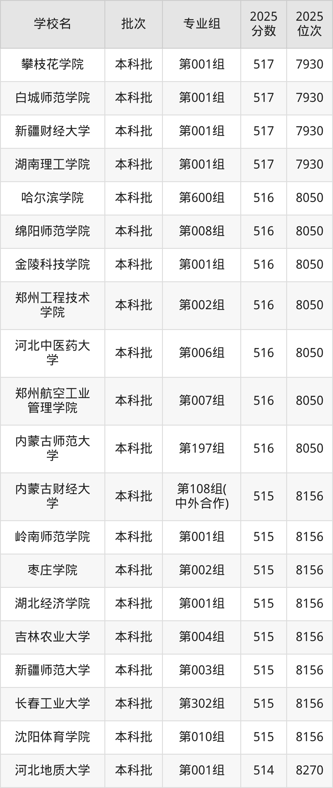 2025年内蒙古高考历史类517分(7847名~7930名)能上的大学有湖南理工学院第001组、新疆财经大学第001组、白城师范学院第001组、攀枝花学院第001组。