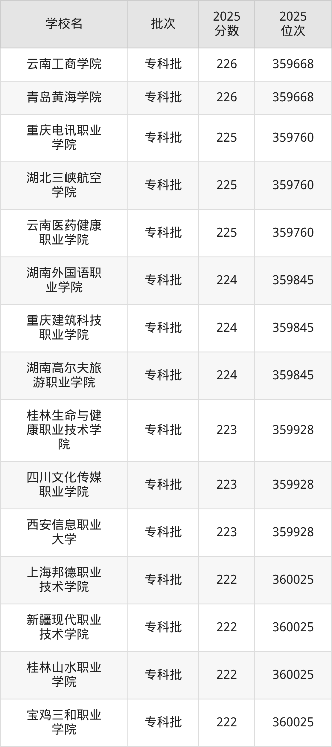 2025年河北高考历史类227分(228176名~228570名)能上的大学有桂林生命与健康职业技术学院、海南健康管理职业技术学院、重庆数字产业职业技术学院。