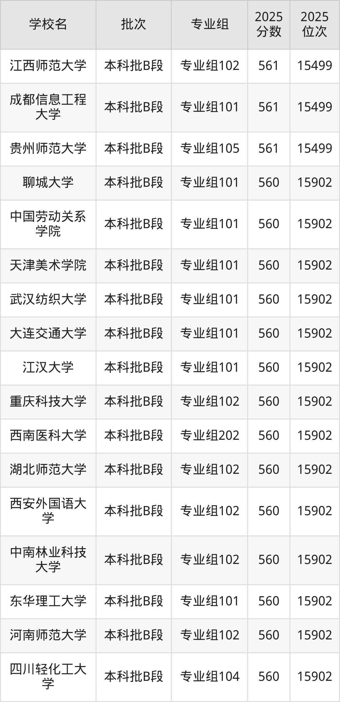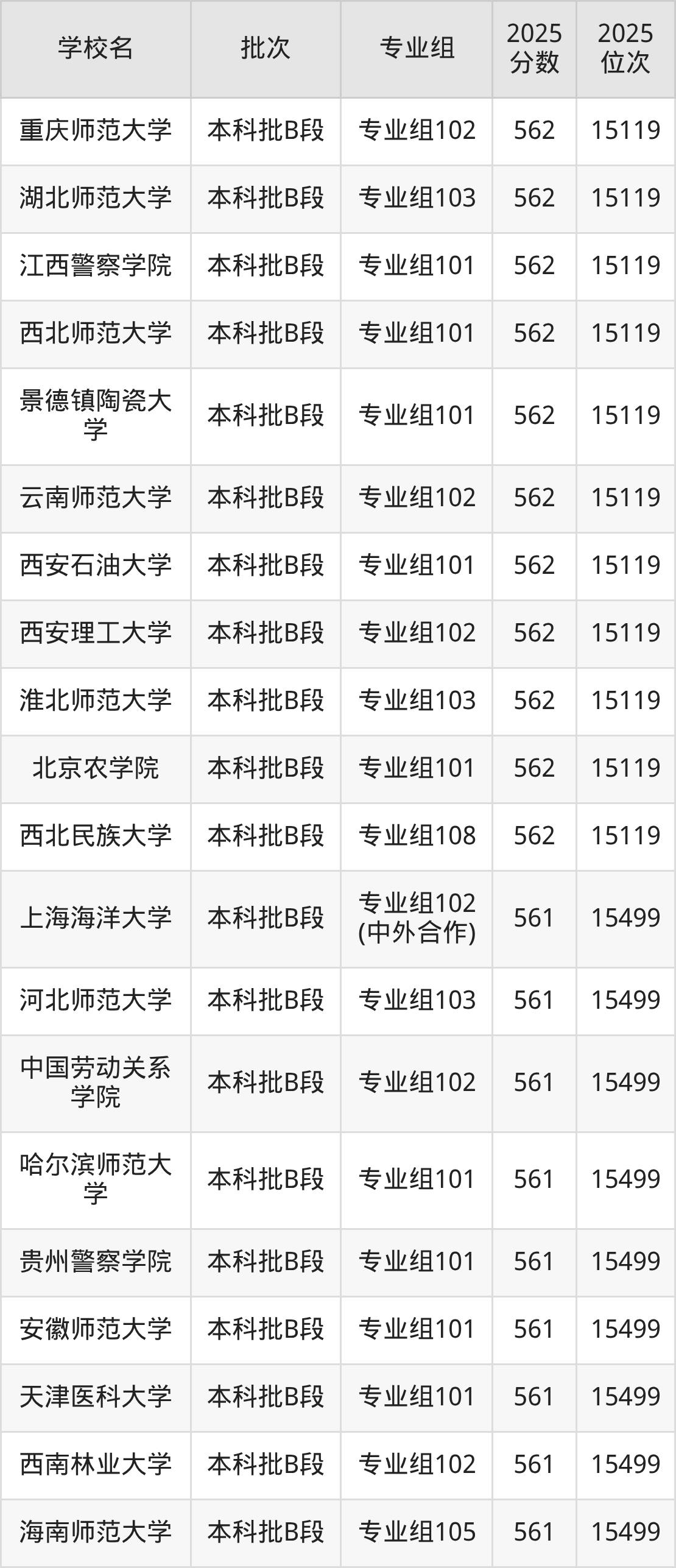 2025年四川高考历史类561分(15120名~15499名)能上的大学有安徽师范大学专业组101、贵州警察学院专业组101、上海海洋大学专业组102(中外合作)、西南林业大学专业组102等。