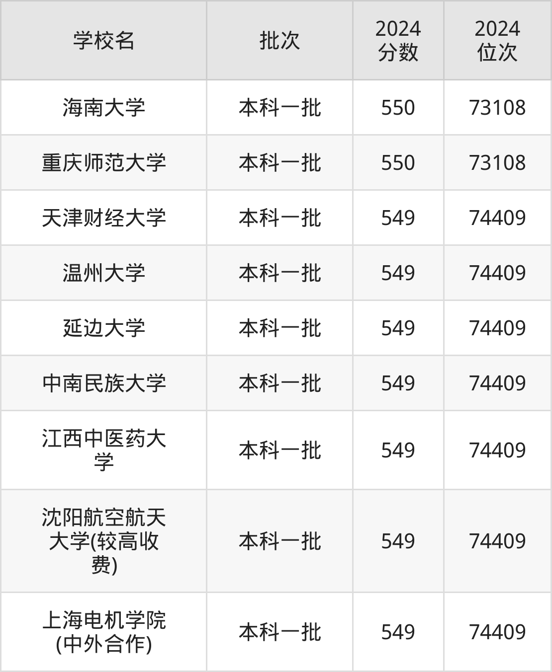 2024年河南高考理科549分(73109名~74409名)能上的大学有天津财经大学、中南民族大学、温州大学、延边大学等。