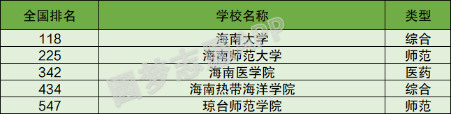 根据教育部公布的最新全国大学名单可知,海南省共有22所大学,其中海南公办本科大学有5所、海南民办本科大学有3所、海南公办专科大学7所、海南民办专科大学6所。