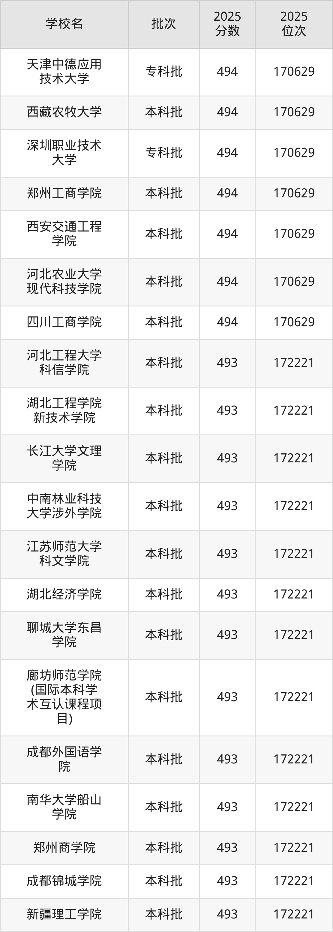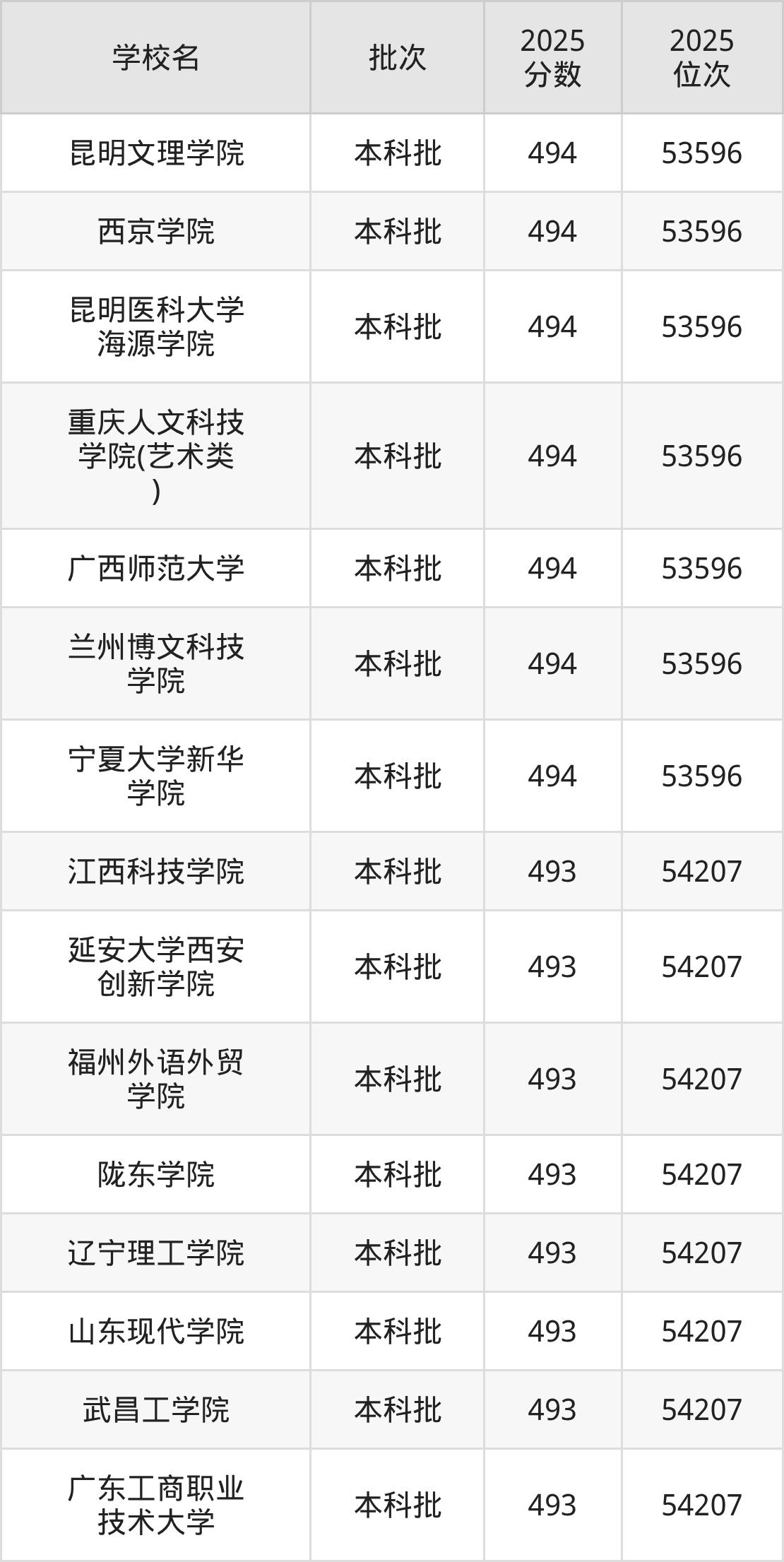 2025年河北高考历史类493分(53597名~54207名)能上的大学有延安大学西安创新学院、江西科技学院、辽宁理工学院、广东工商职业技术大学等。