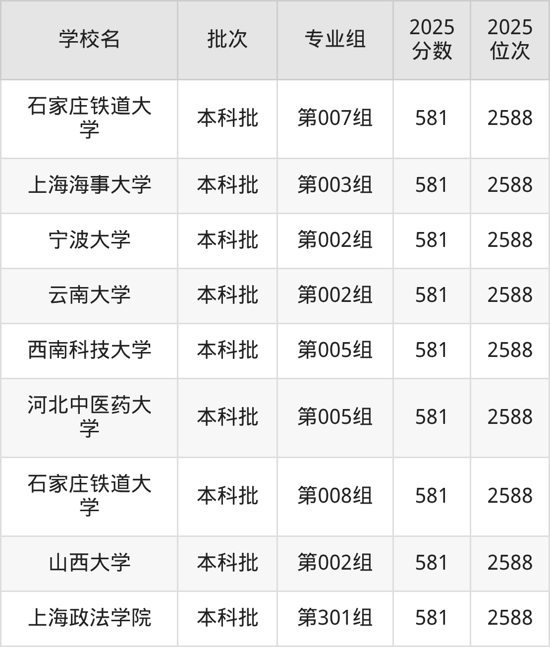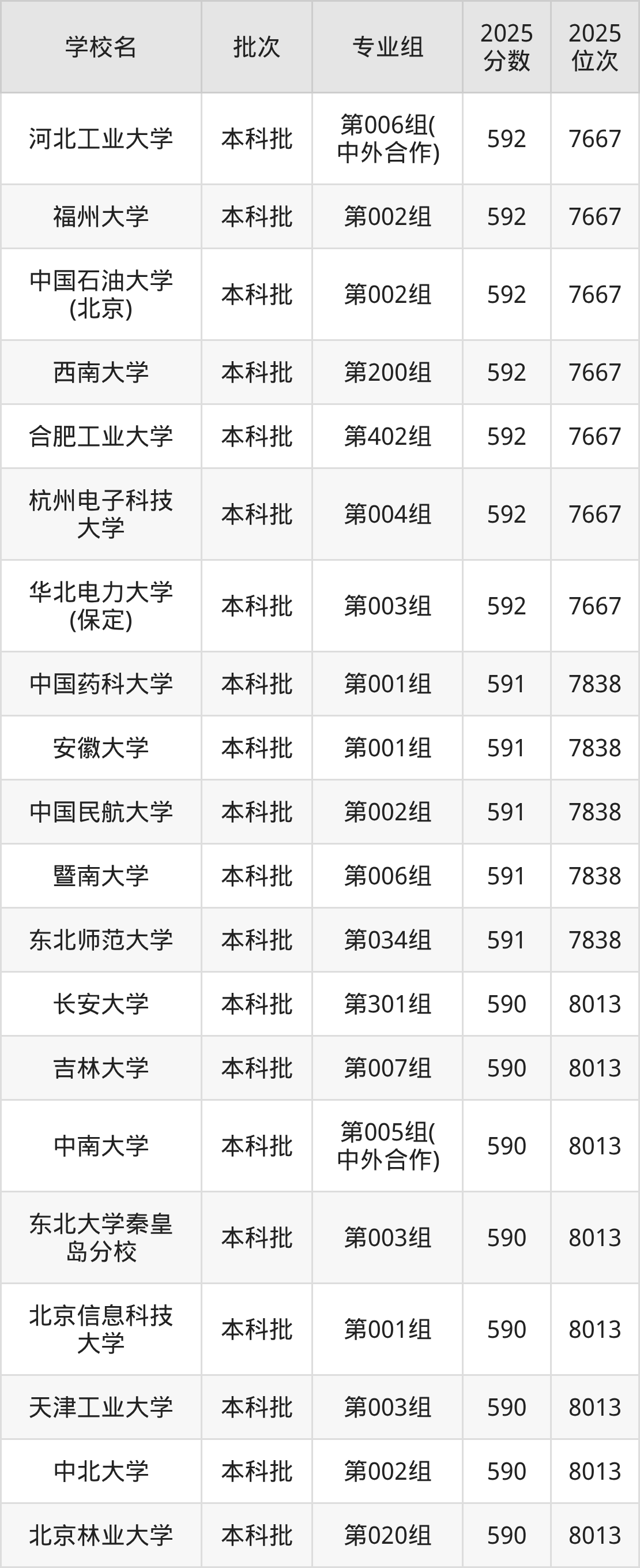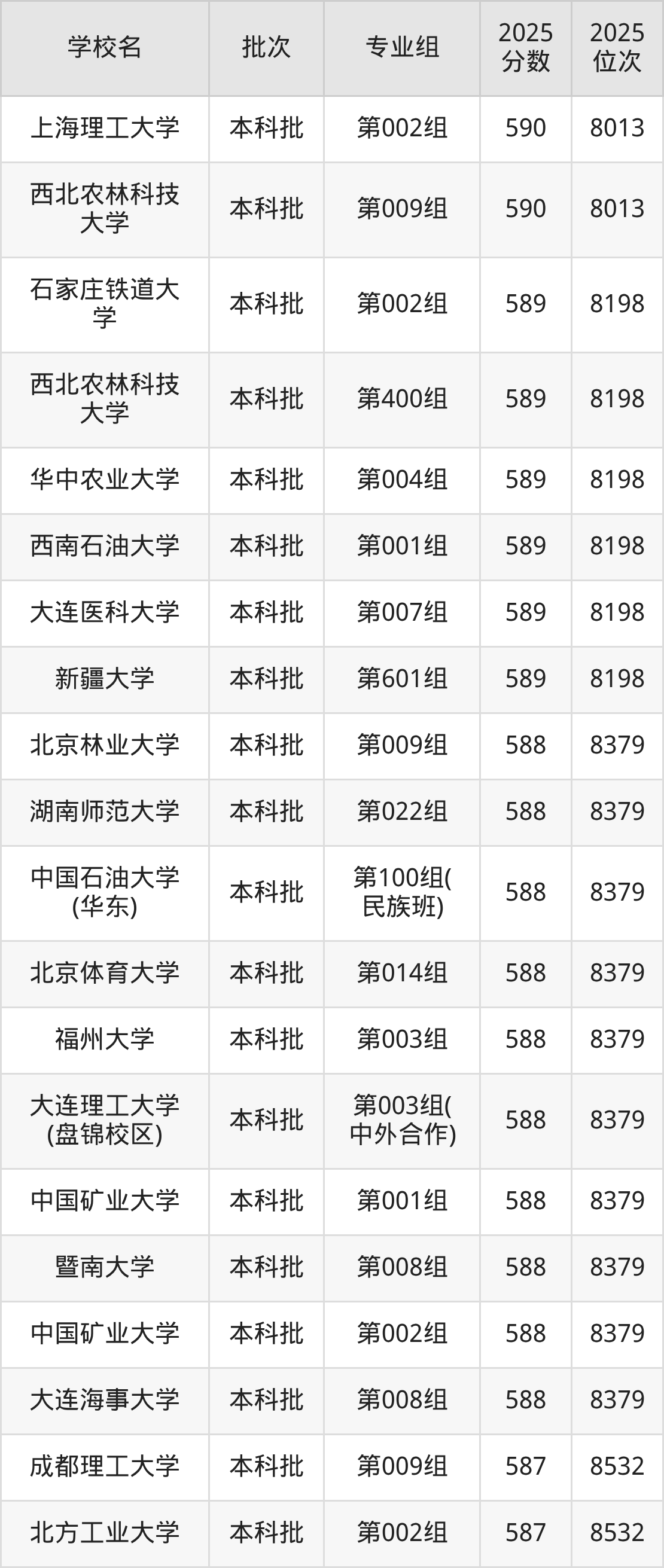 2025年内蒙古高考物理类589分(8014名~8198名)能上的大学有西南石油大学第001组、华中农业大学第004组、石家庄铁道大学第002组、大连医科大学第007组等。