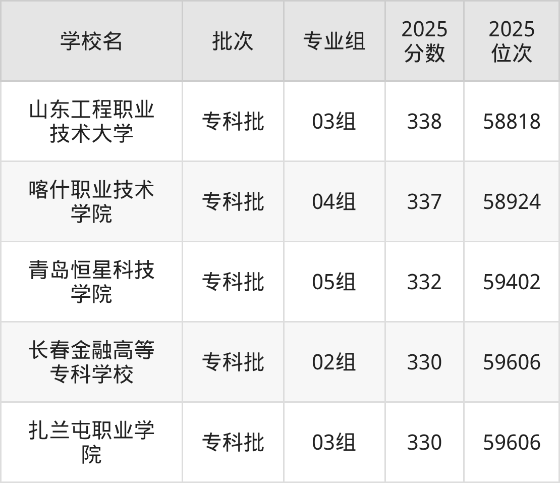 2025年江苏高考物理类334分(59110名~59187名)录取位次低于该区间(较稳妥)的有青岛恒星科技学院05组(59402名)、扎兰屯职业学院03组(59606名)等;录取位次高于该区间(可冲)的有喀什职业技术学院04组(58924名)、山东工程职业技术大学03组(58818名)等。