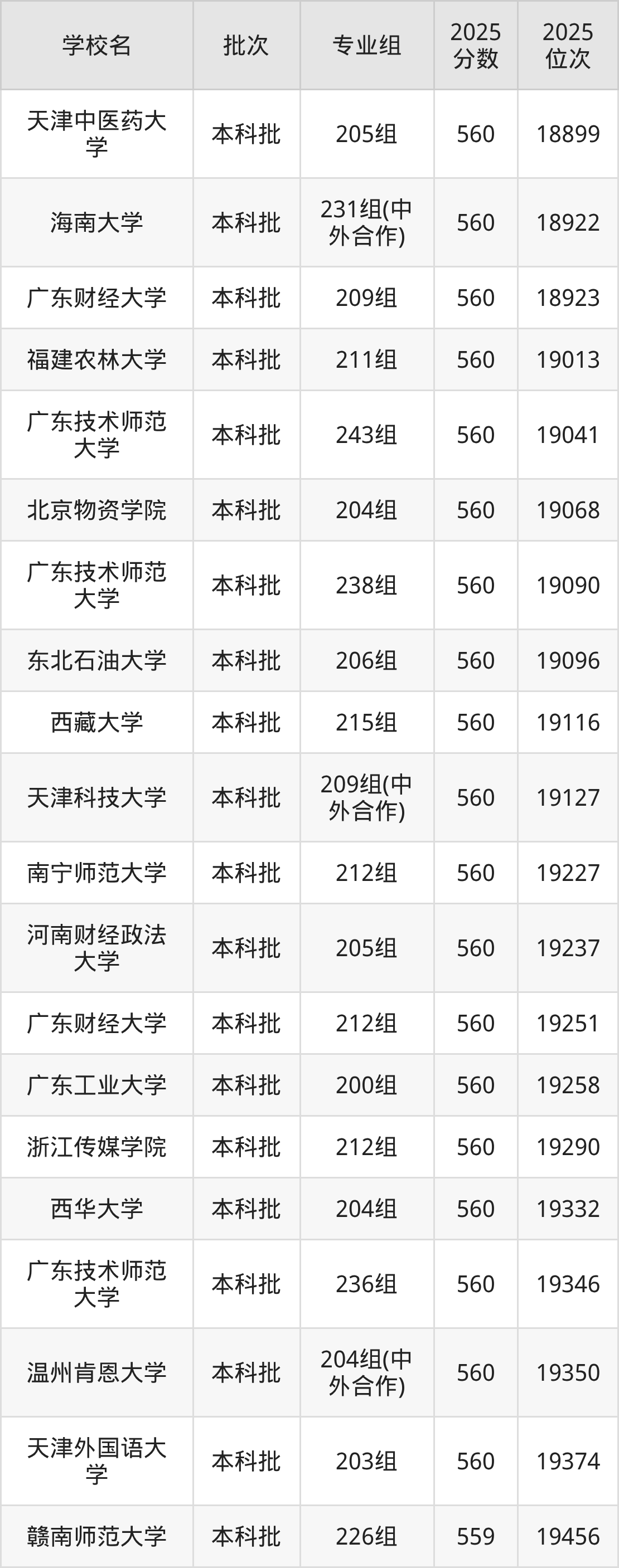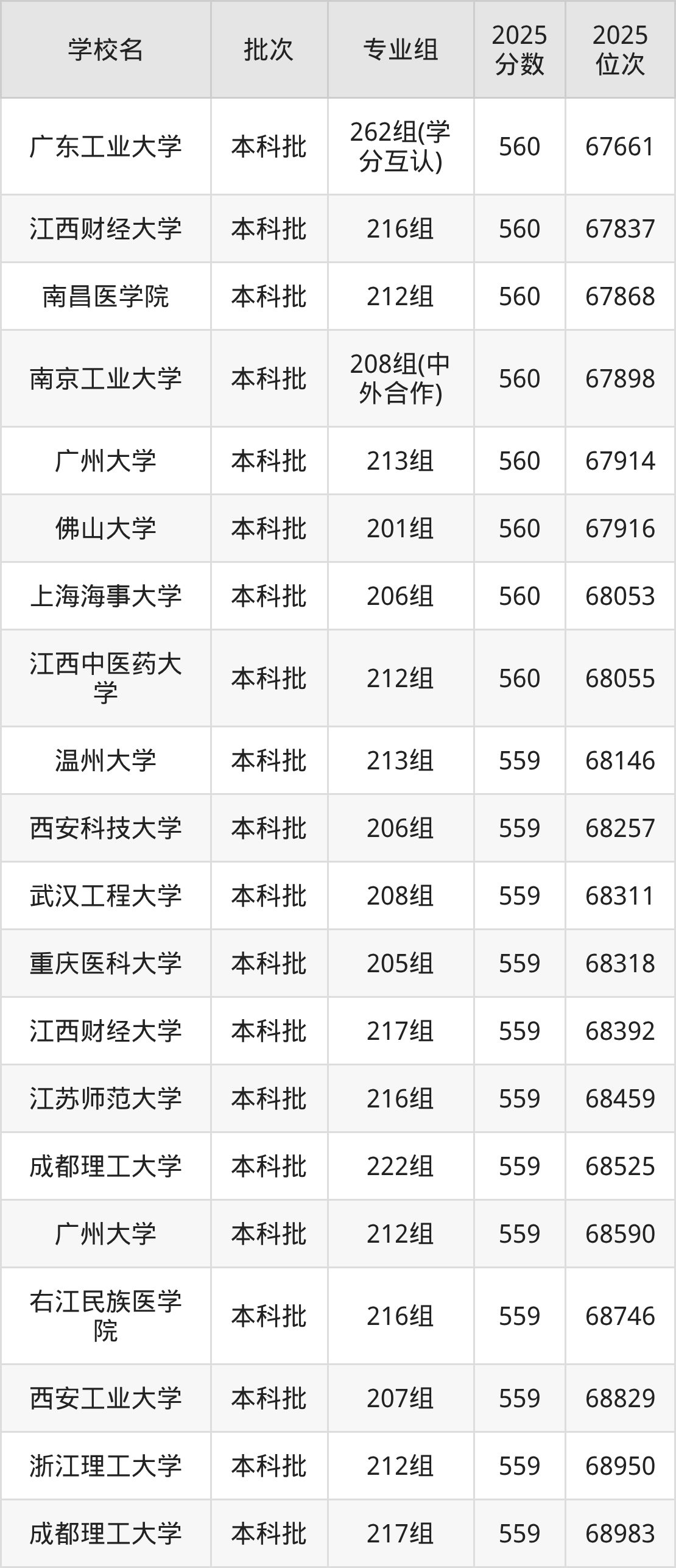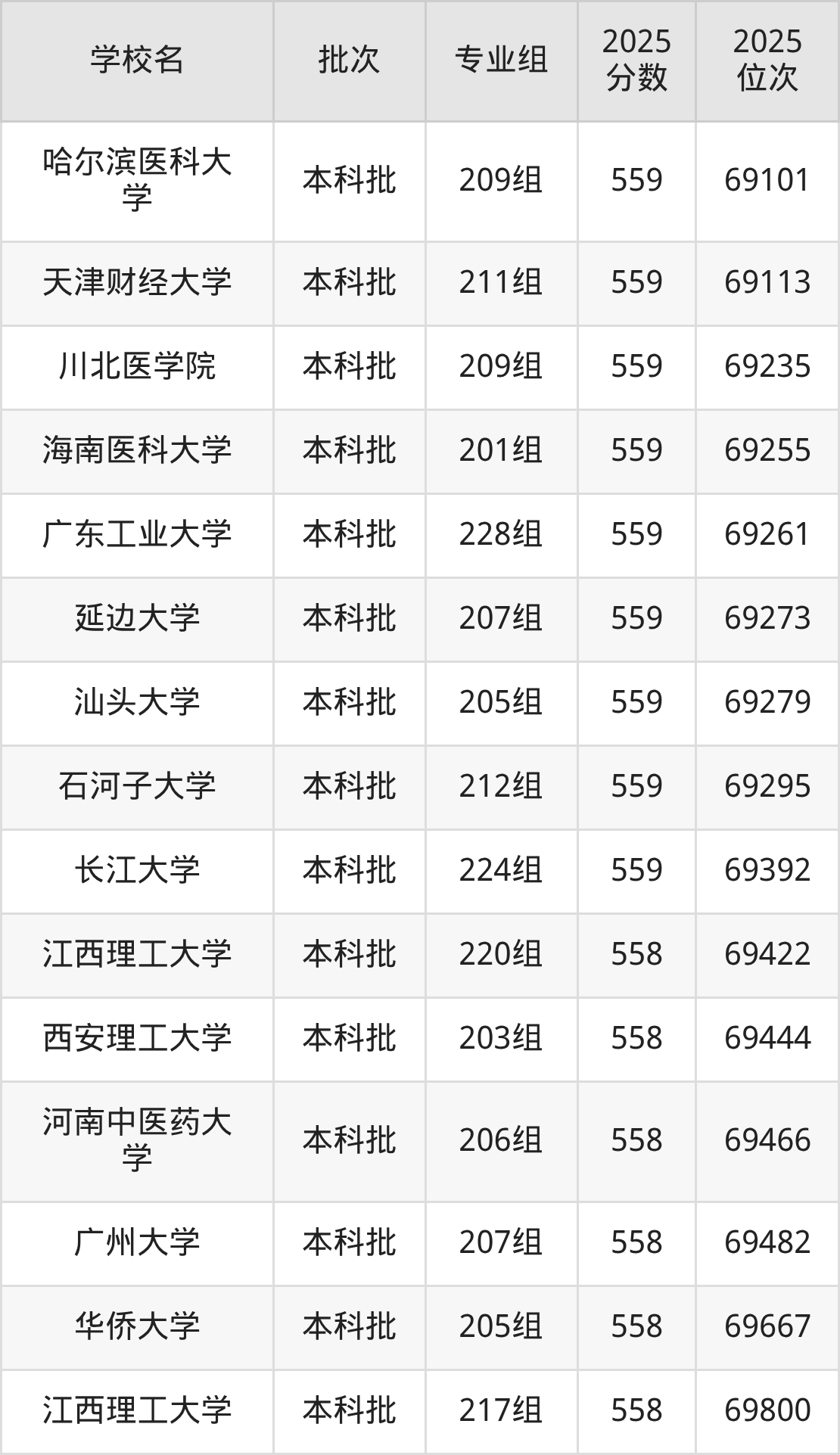 2025年广东高考物理类559分(68129名~69412名)能上的大学有天津财经大学211组、延边大学207组、哈尔滨医科大学209组、江苏师范大学216组等。