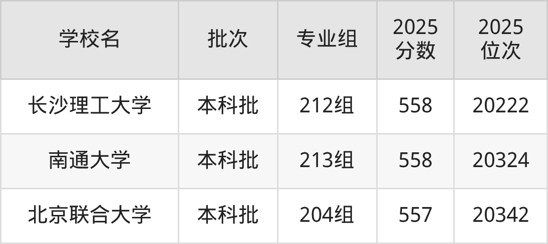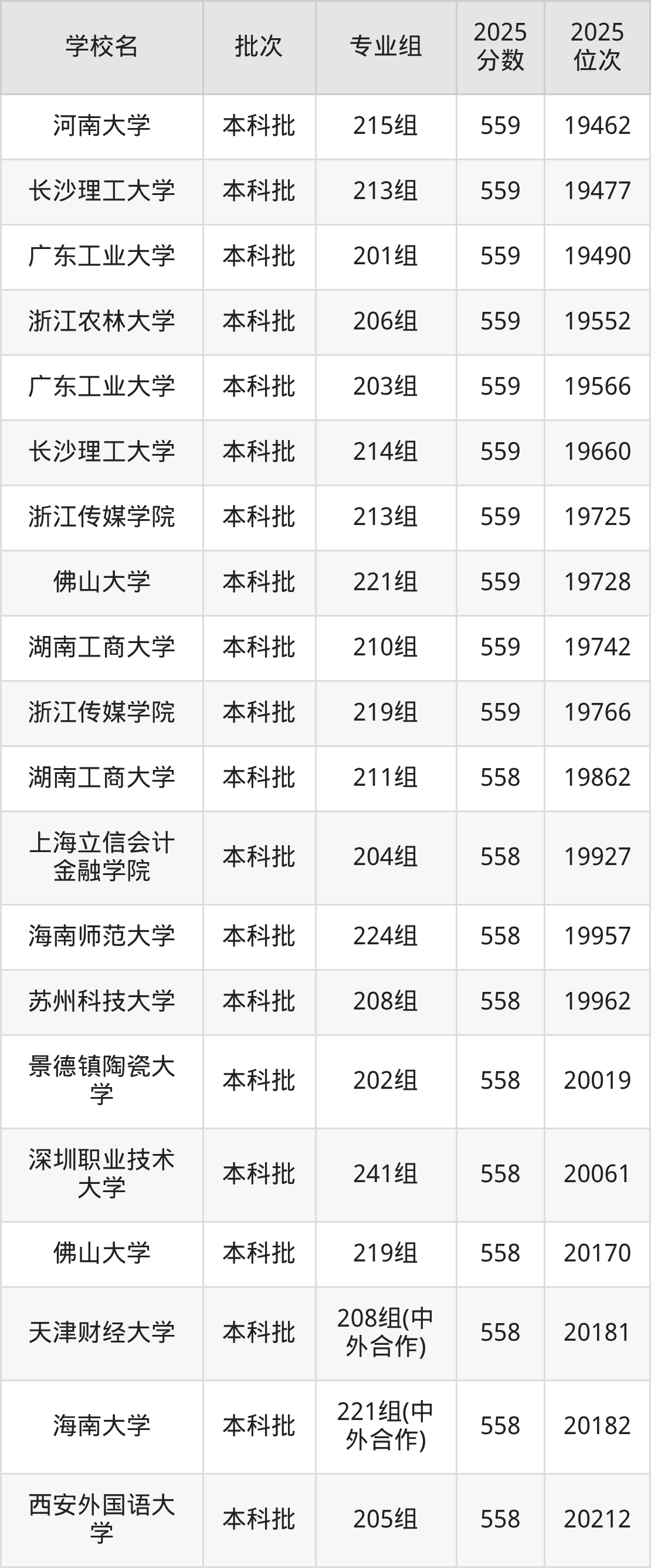 2025年广东高考历史类559分(19389名~19858名)能上的大学有浙江农林大学206组、赣南师范大学226组、河南大学215组、长沙理工大学213组等。