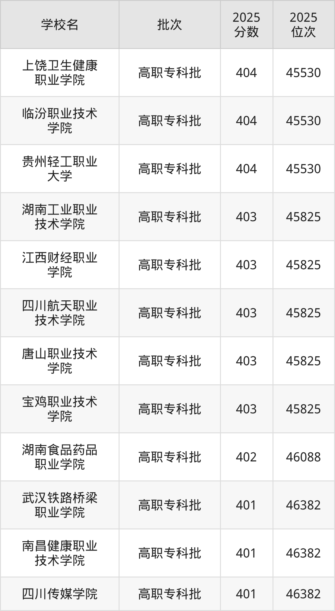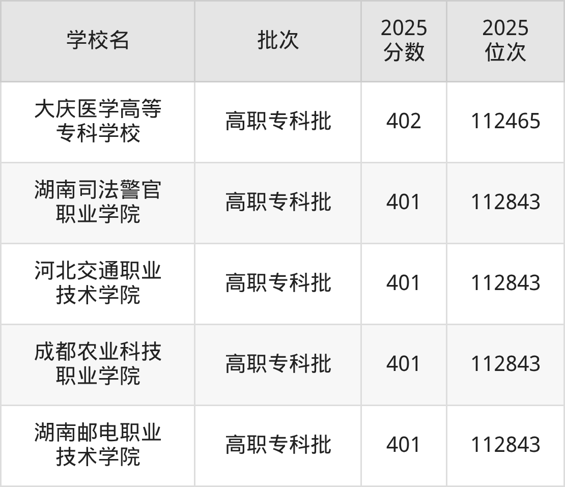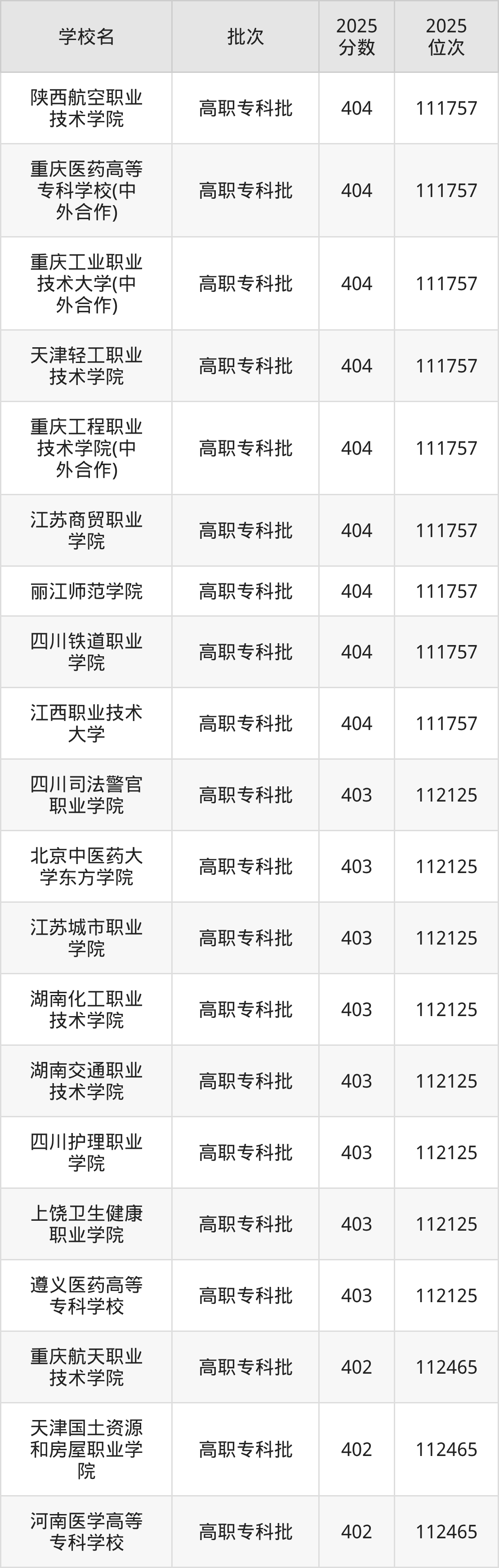 2025年重庆高考物理类402分(112126名~112465名)能上的大学有大庆医学高等专科学校、河南医学高等专科学校、天津国土资源和房屋职业学院、重庆航天职业技术学院。