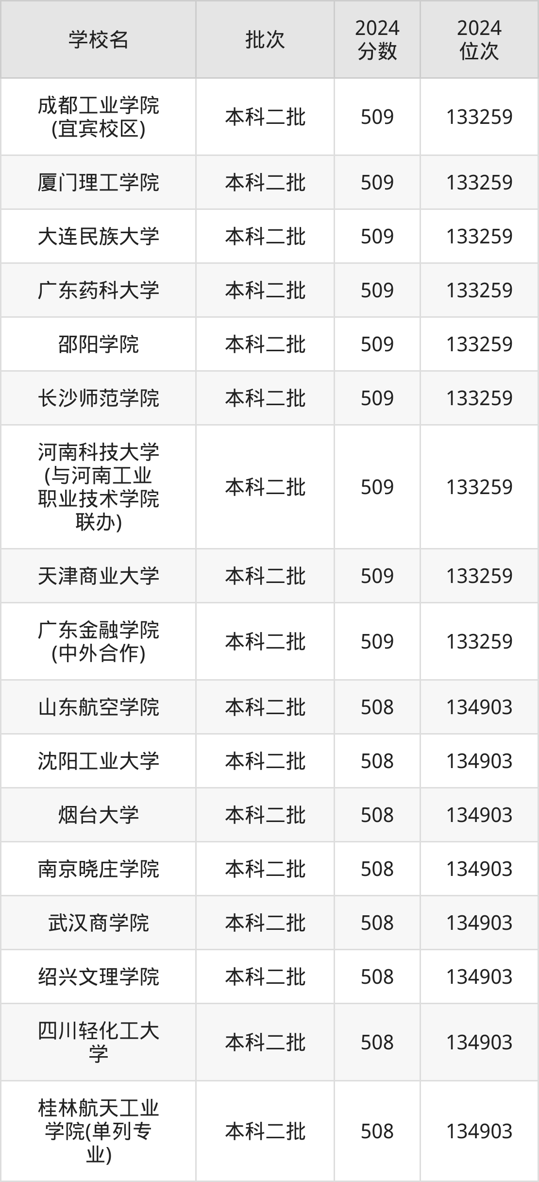 这些都是2025年高考理科133260名~134903名考生可以报考的大学,更多学校名单如下表所示: