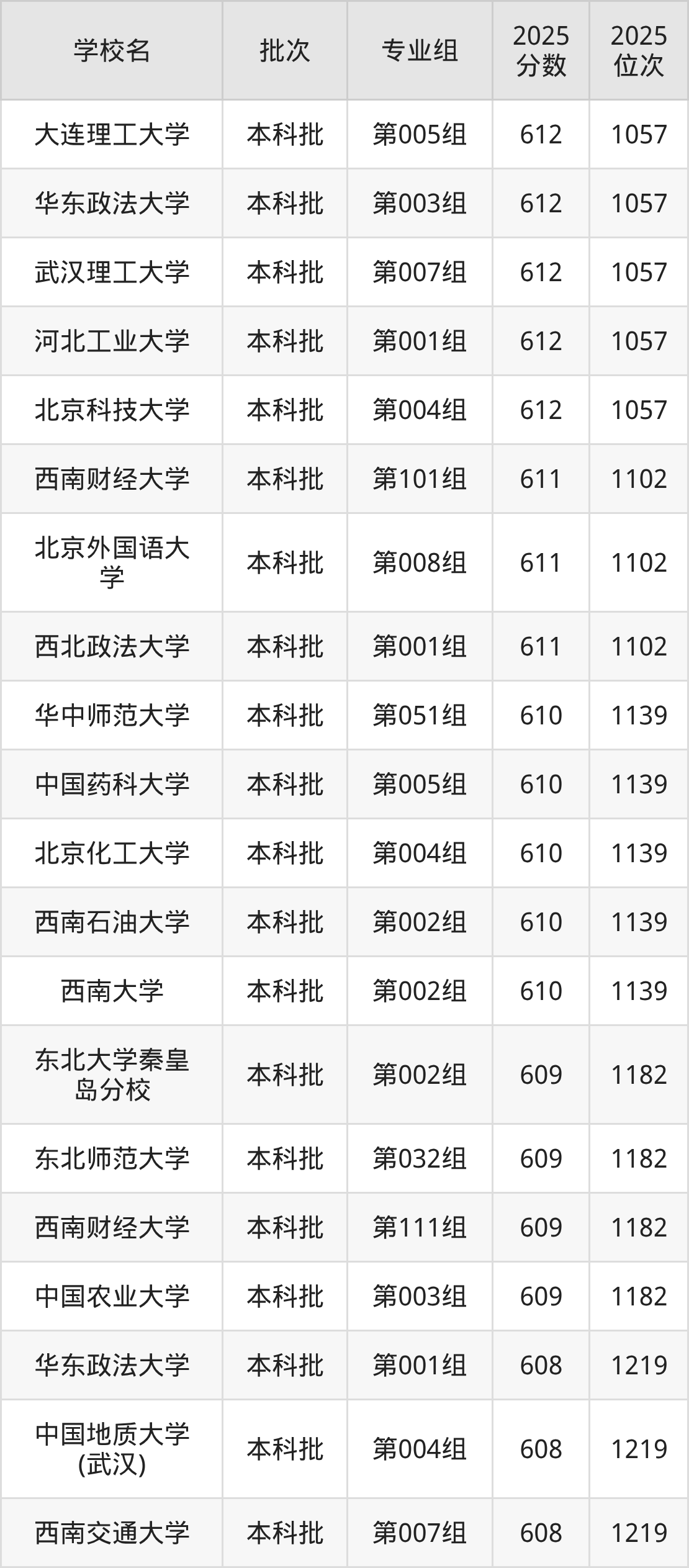 另外录取位次低于该区间(较稳妥)的有哈尔滨工程大学第101组(1612名)、山东科技大学第001组(1612名)等;录取位次高于该区间(可冲)的有北京中医药大学第005组(1530名)、西北大学第099组(1530名)等。